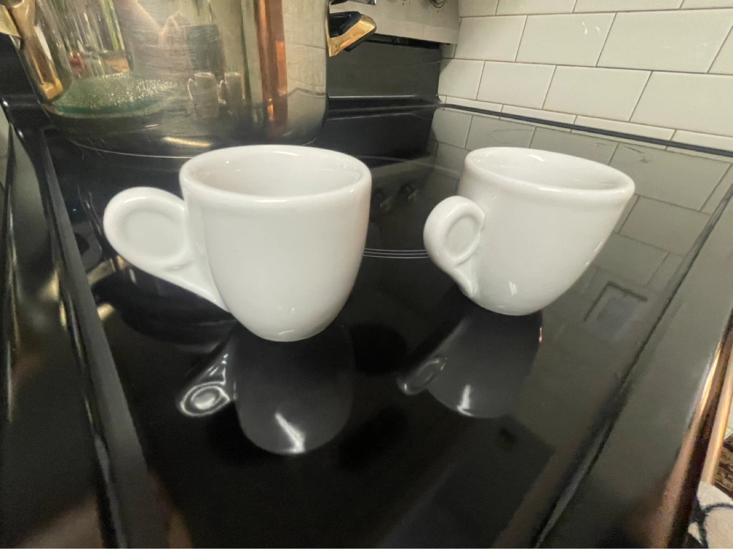 Two small white porcelain espresso cups from Ionia, Greece. These cups are designed for espresso or small drinks. Made of durable porcelain.