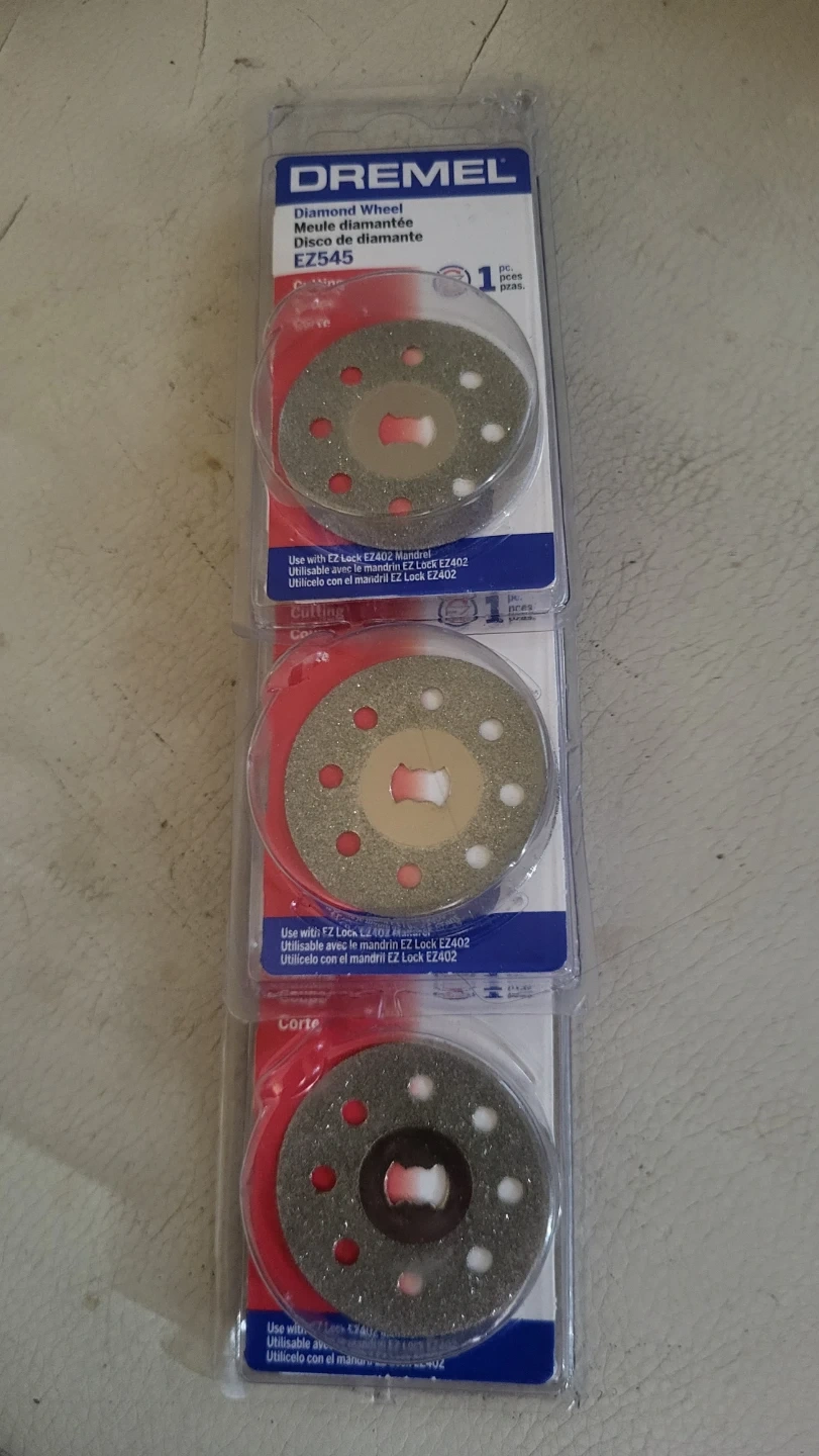 This is 3 single packs of Dremel EZ545 diamond cutting wheels. They're 1 1/2" (38.1mm) in diameter and are made for cutting. Use with EZ Lock system. Max RPM 35,000. $15ea or 3 for $30