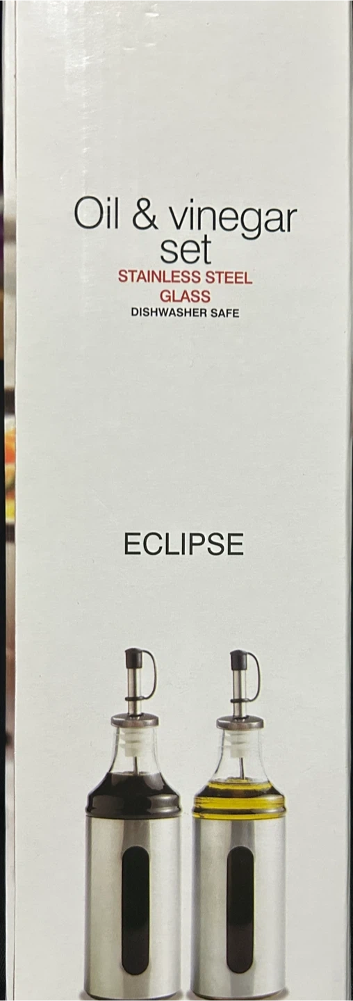 brand new Think Kitchen Eclipse oil and vinegar set, still in its original packaging! This stylish set features a stainless steel and glass design, and is dishwasher safe for easy cleaning. Perfect for adding a touch of elegance to your kitchen or dining table