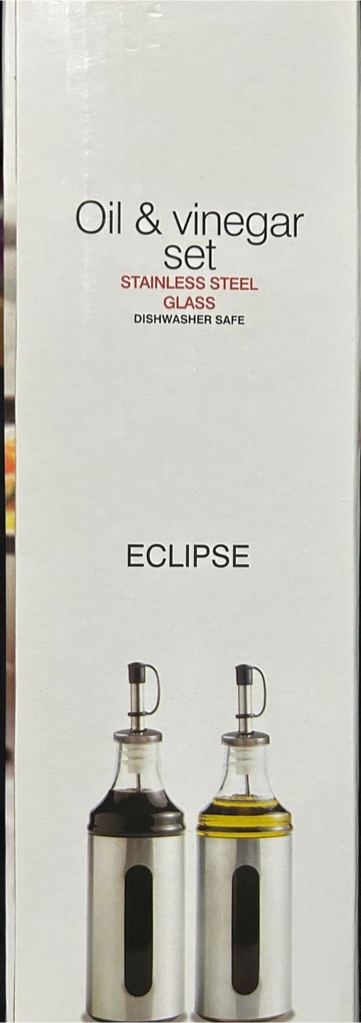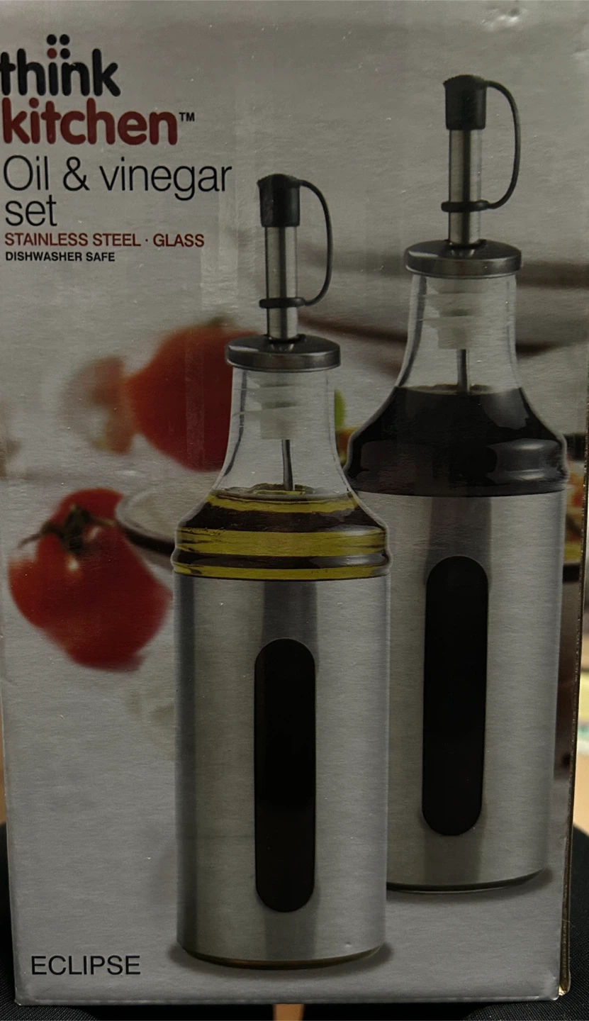 brand new Think Kitchen Eclipse oil and vinegar set, still in its original packaging! This stylish set features a stainless steel and glass design, and is dishwasher safe for easy cleaning. Perfect for adding a touch of elegance to your kitchen or dining table