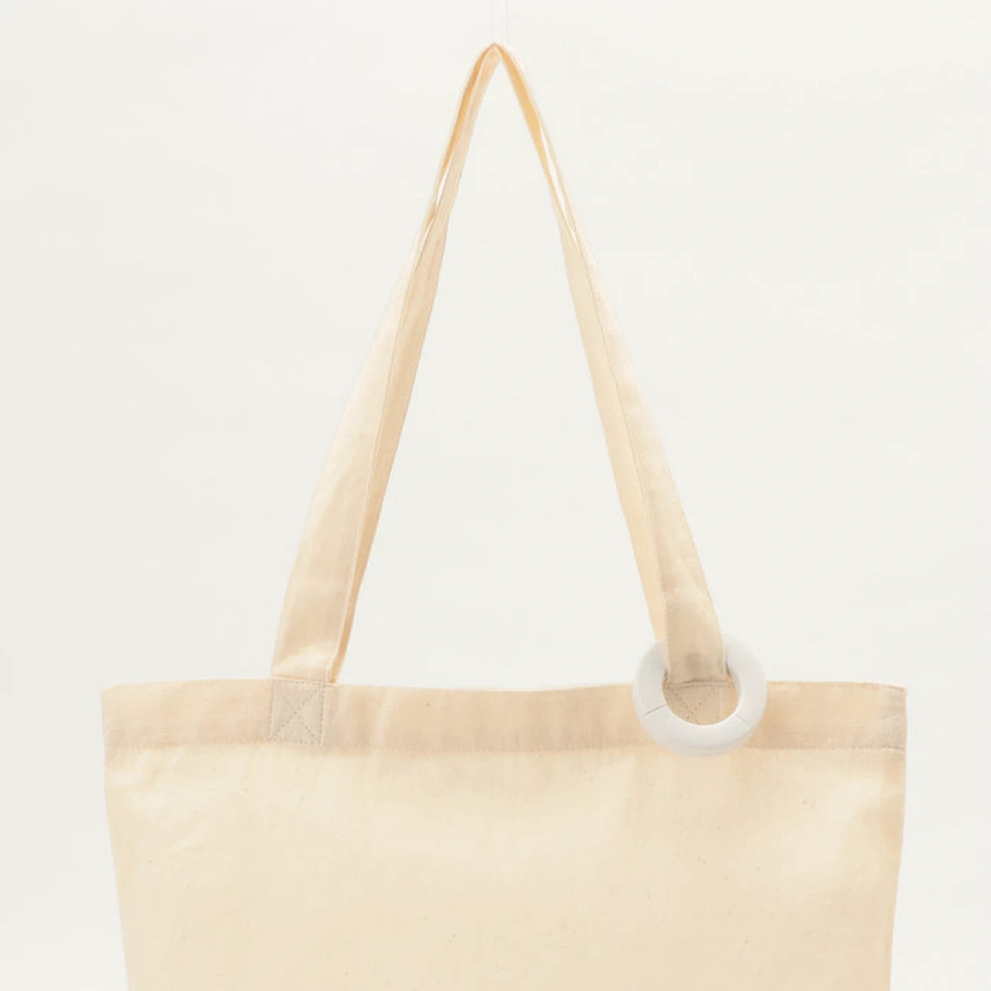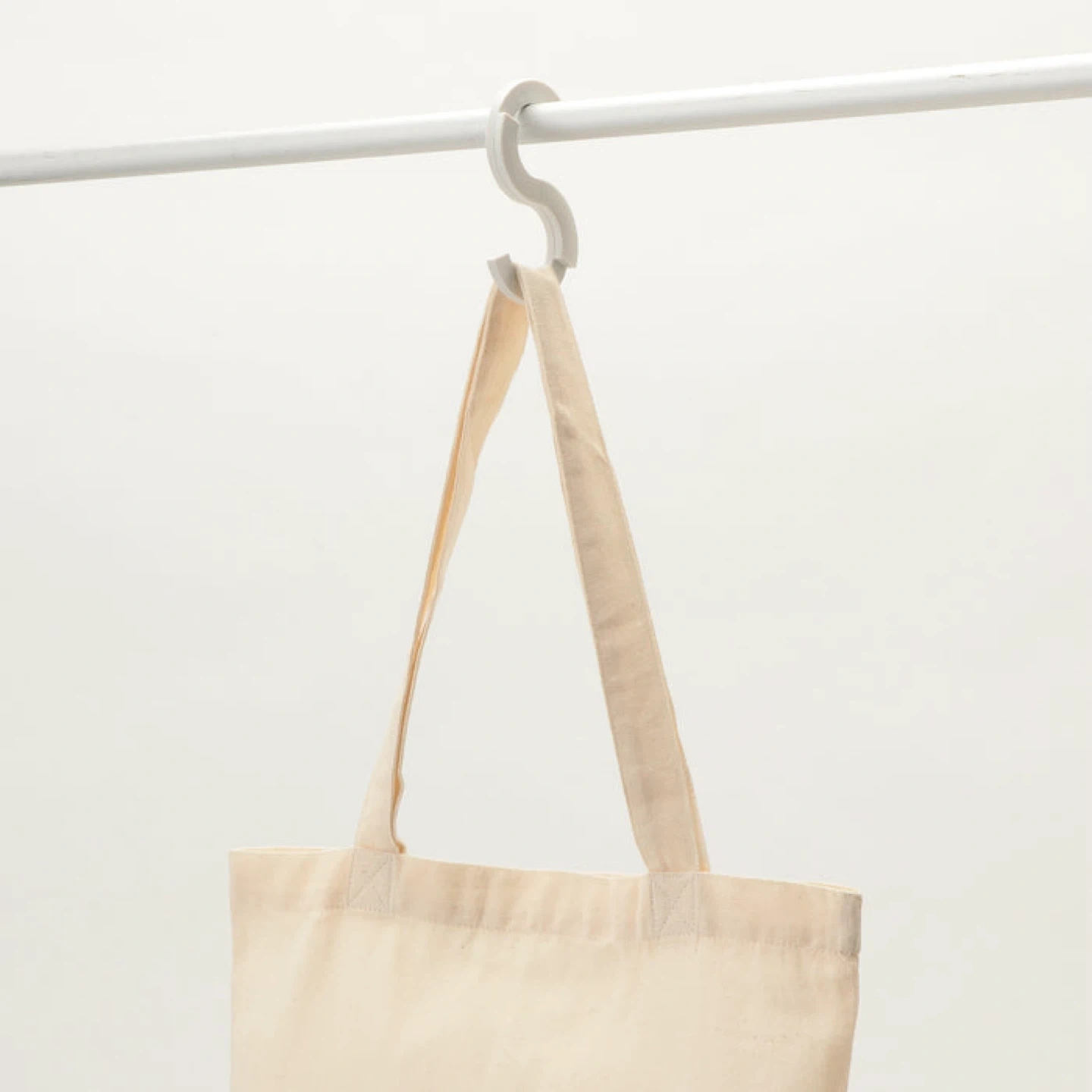 A versatile white S-hook designed for hanging bags on rods. It's made of durable plastic and conveniently splits for easy placement. Use it to keep your totes or shopping bags accessible!