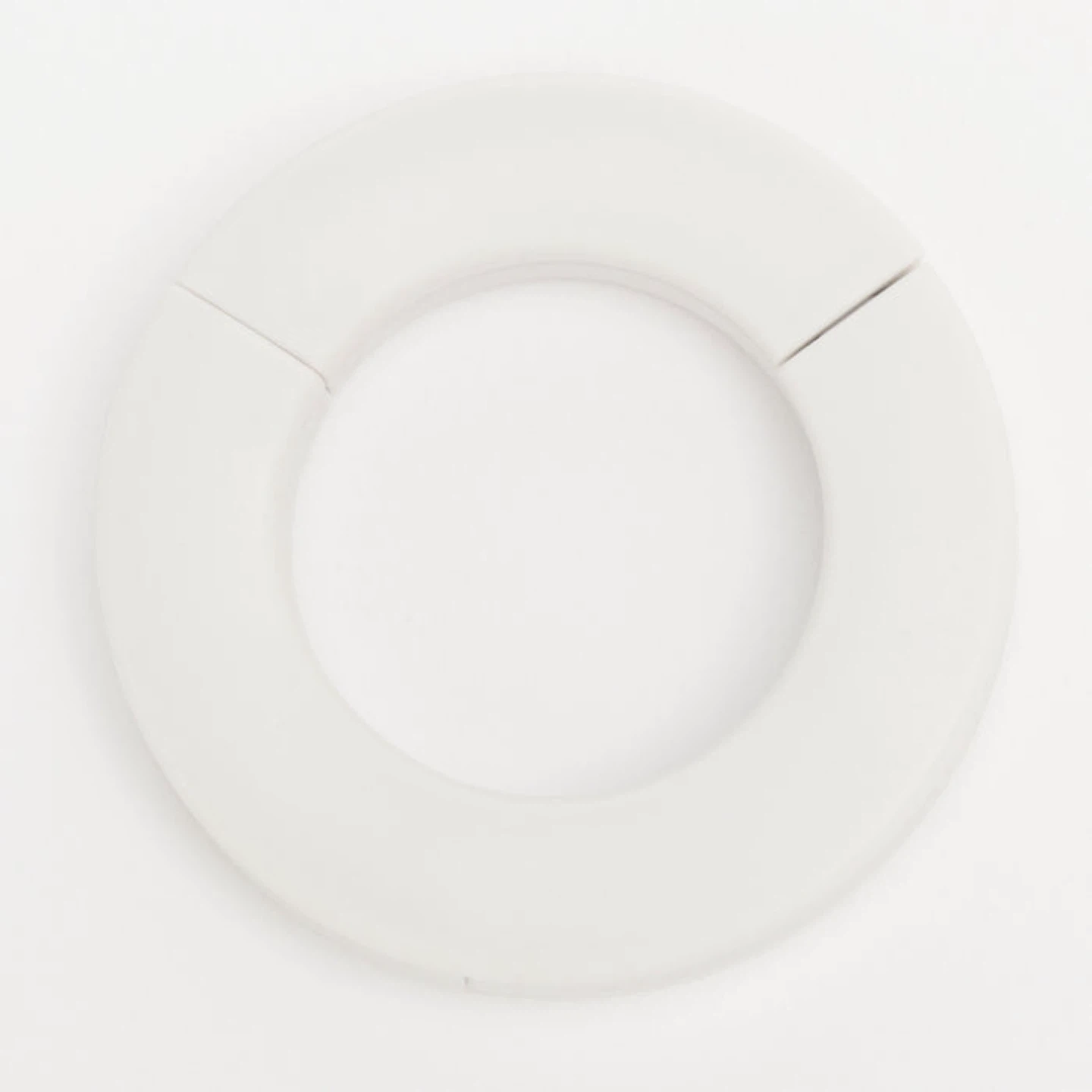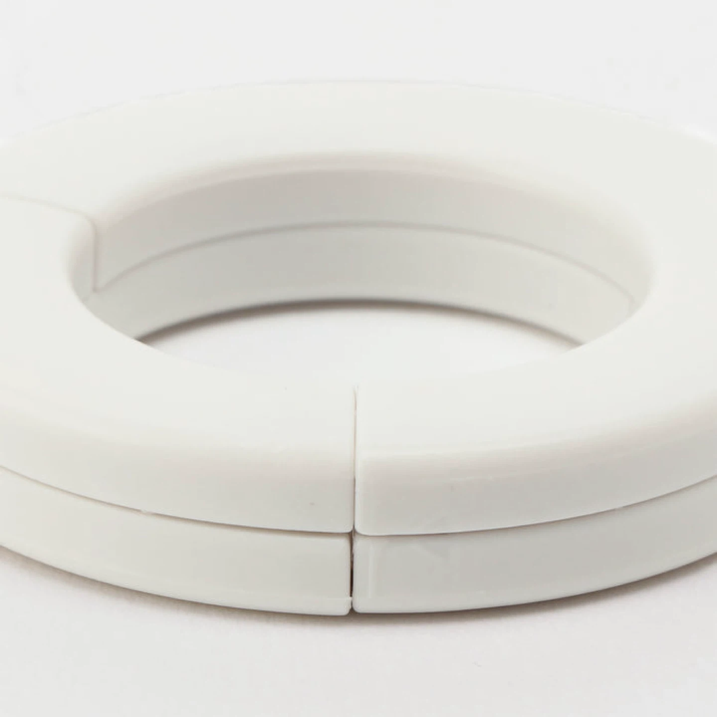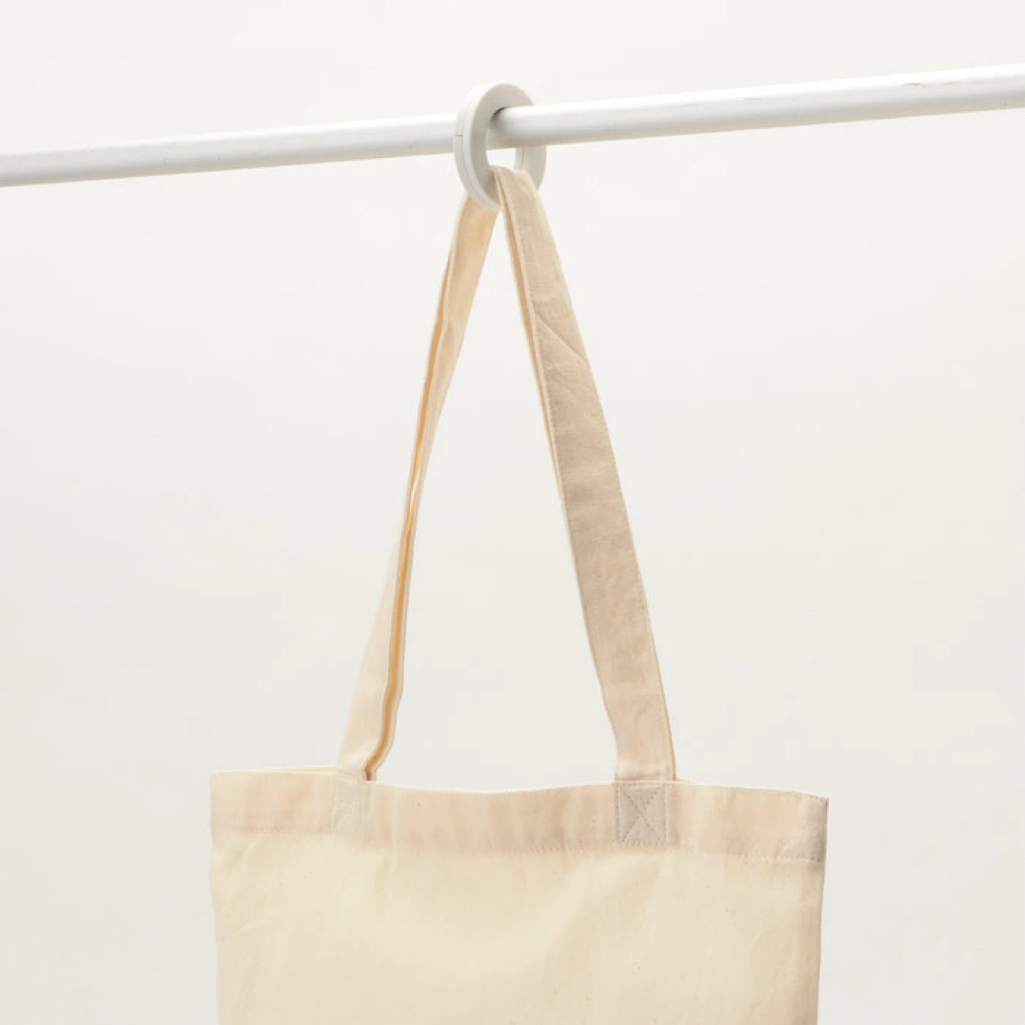 A versatile white S-hook designed for hanging bags on rods. It's made of durable plastic and conveniently splits for easy placement. Use it to keep your totes or shopping bags accessible!