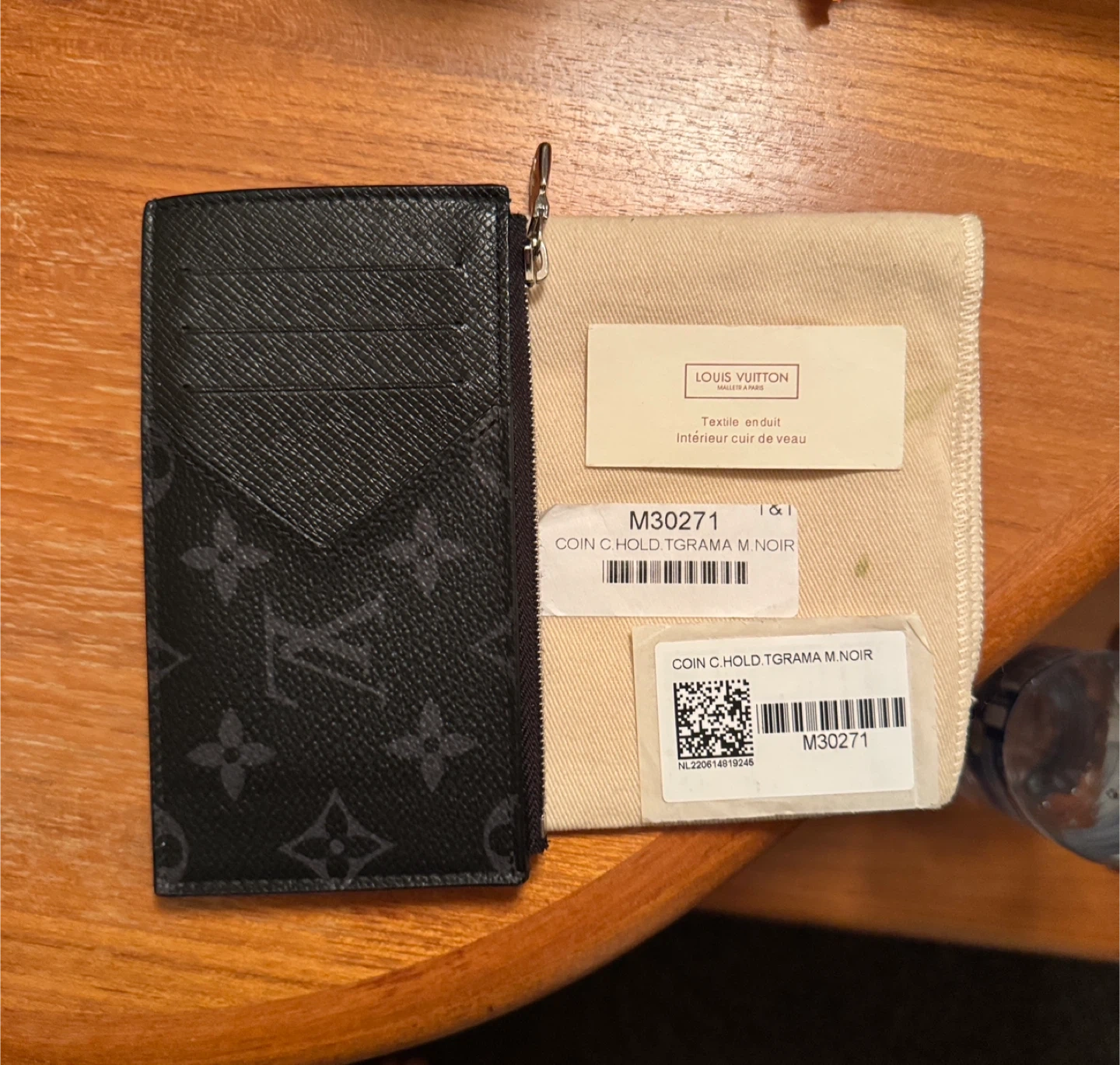 Selling a Louis Vuitton coin card holder in black. It's in great condition and comes with its original dust bag. The model number is M30271. Perfect for keeping your cards and coins organized in style!