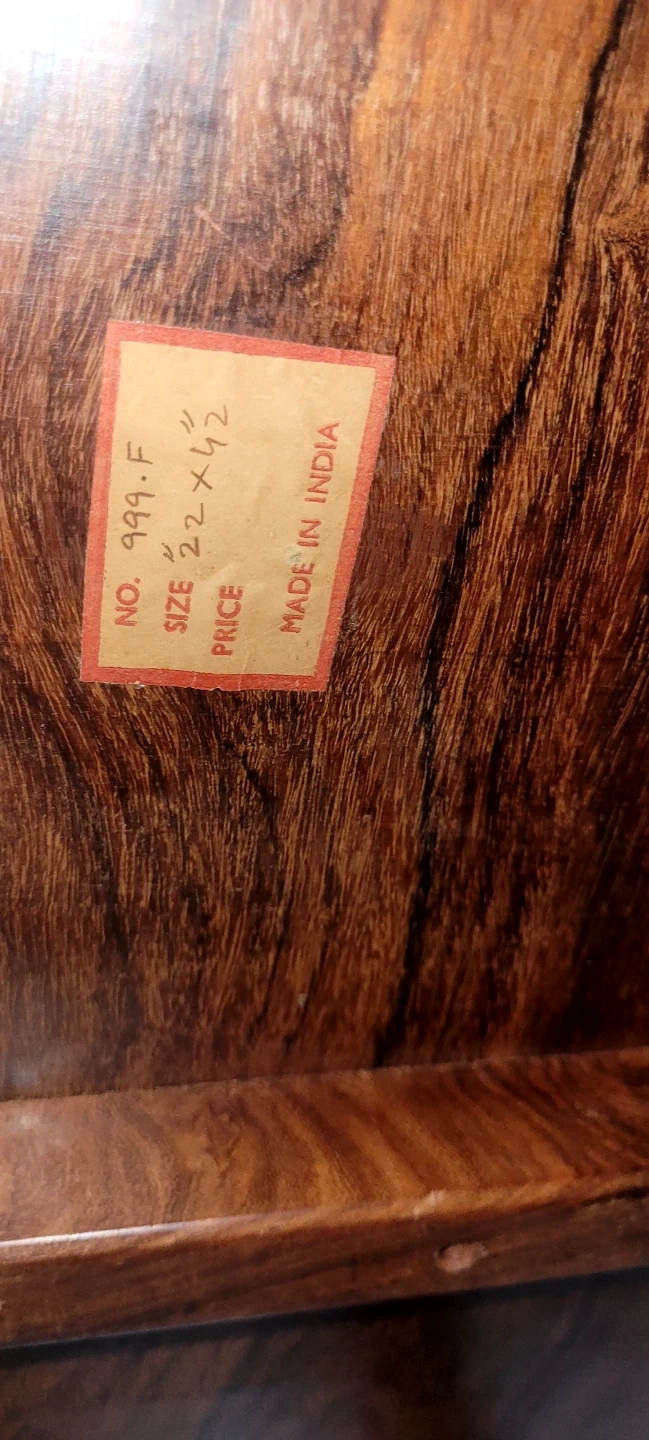 Oval coffee table made of wood with intricate inlay details featuring an elephant scene. Size is 22"x42". Made in India.