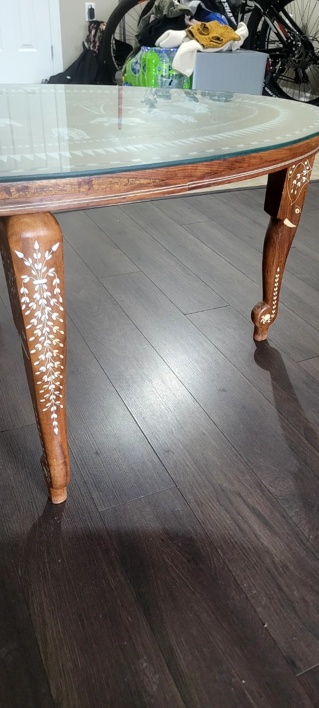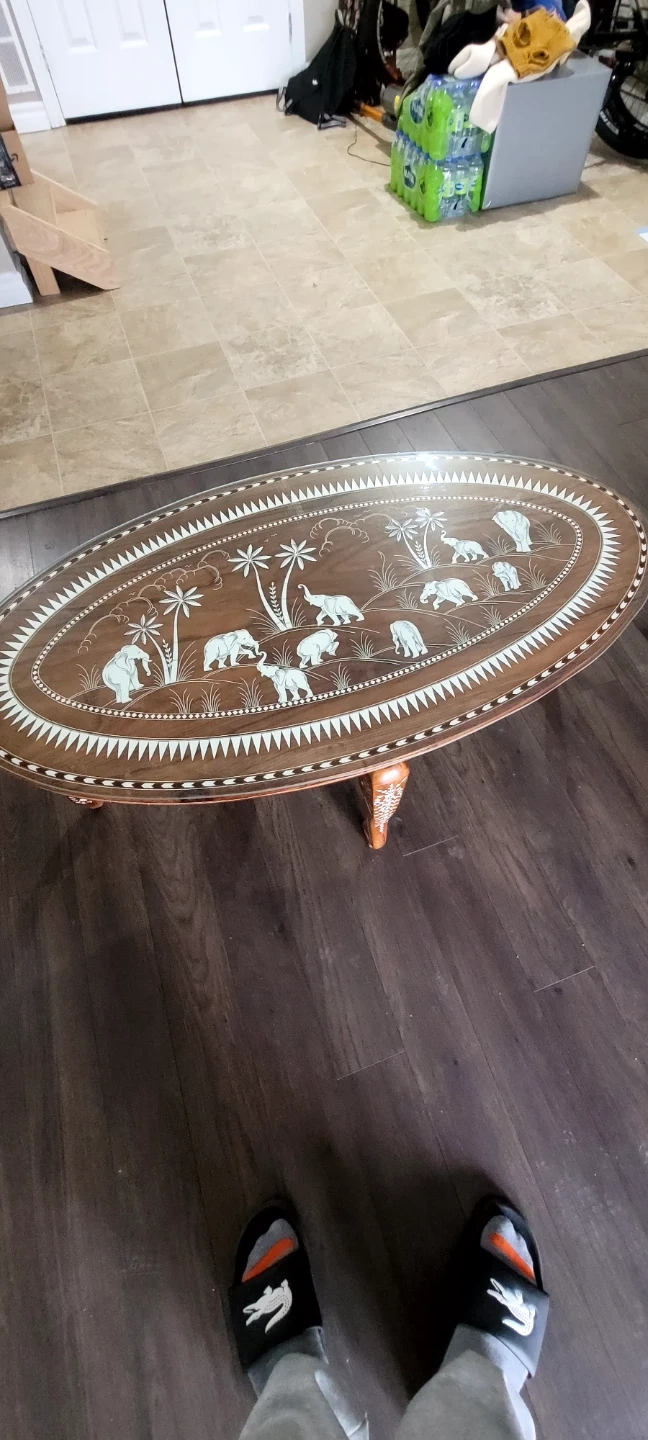 Oval coffee table made of wood with intricate inlay details featuring an elephant scene. Size is 22"x42". Made in India.
