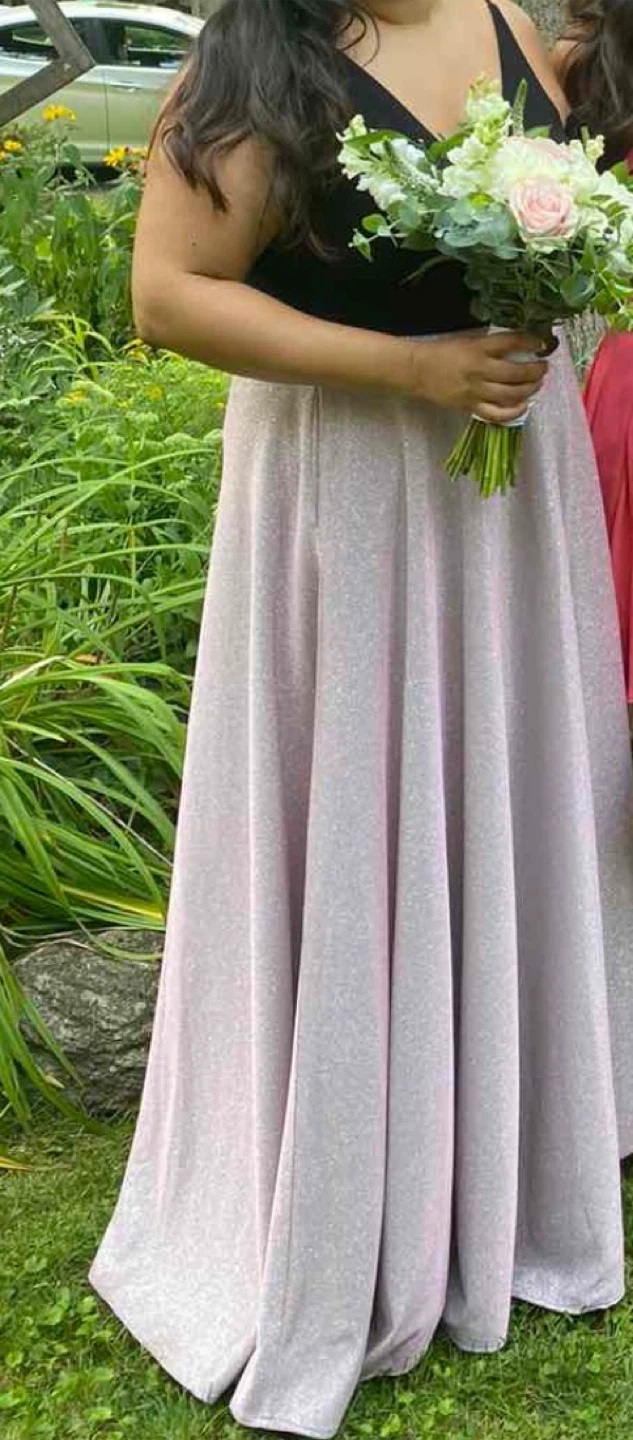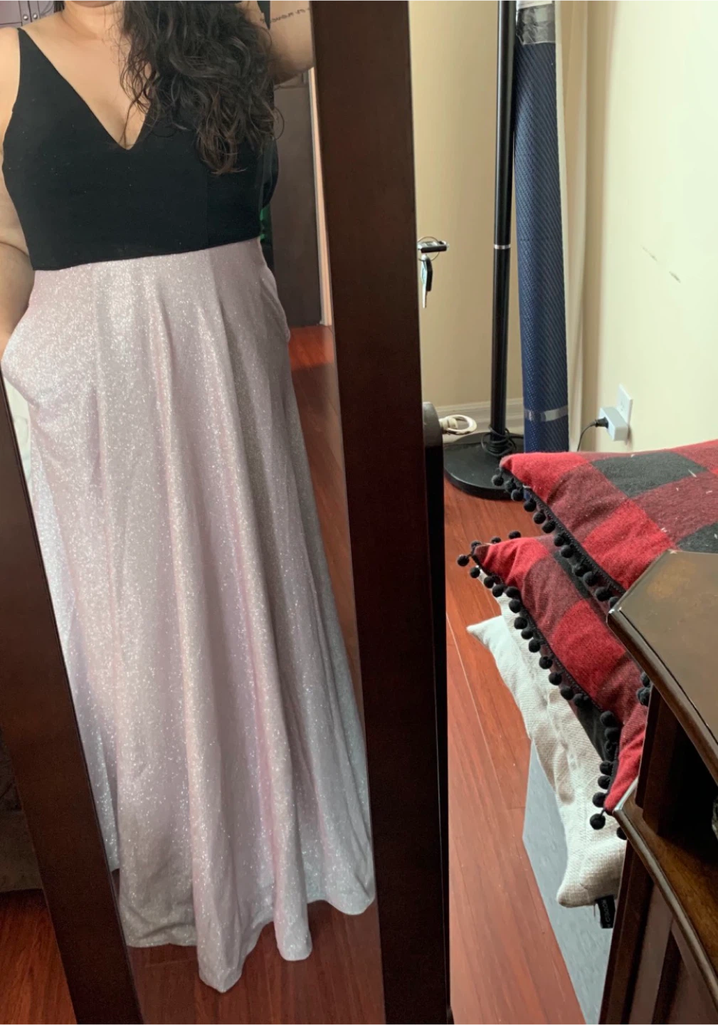A sparkly pink formal dress with a black bodice. It features a flattering A-line silhouette and pockets. Perfect for formal events or a night out!