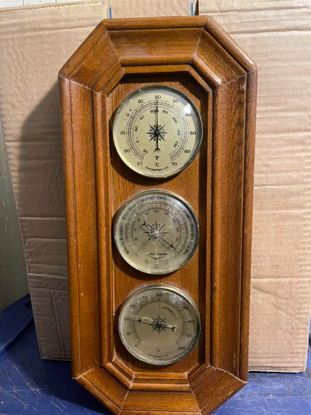 This set includes a thermometer, barometer, and hygrometer, all housed in a wooden frame. The thermometer measures temperature in Celsius and Fahrenheit, while the barometer indicates changes in weather.
