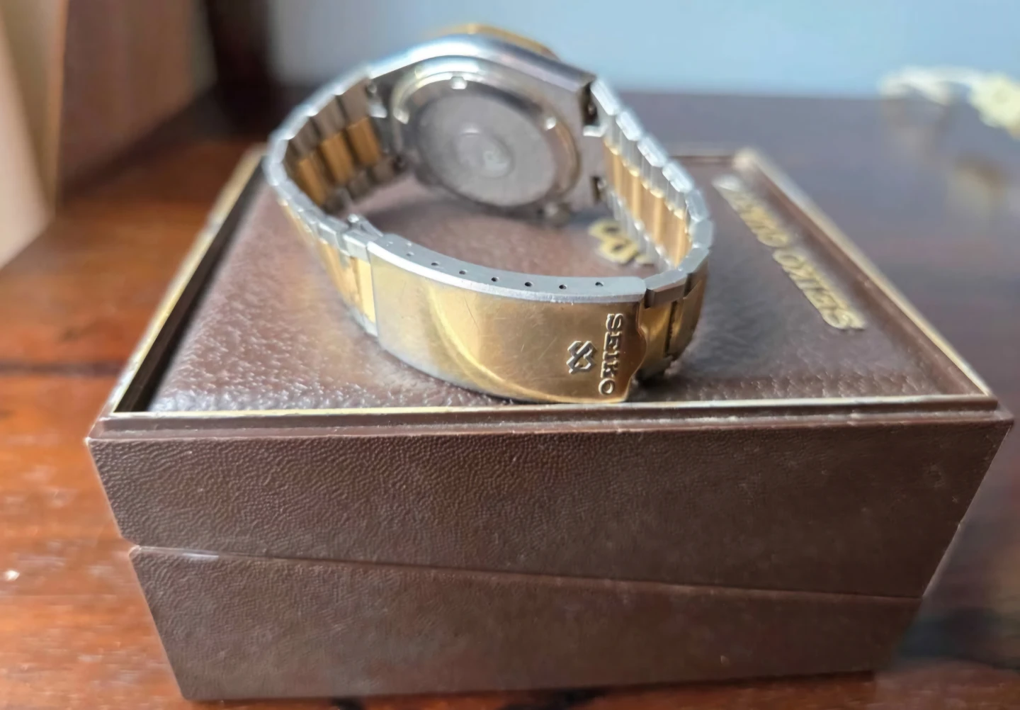 Made in Japan during the 1980s, this classic timepiece features a gold bezel, silver case, and tri-fold clasp bracelet with both gold and silver tones.