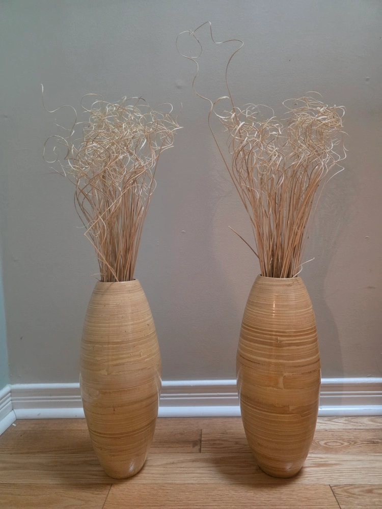 Two beautiful bamboo vases, perfect for adding a touch of natural elegance to your home! They come with the dried grass shown in the photos, ready to display. These vases are in great condition and would look lovely in any room