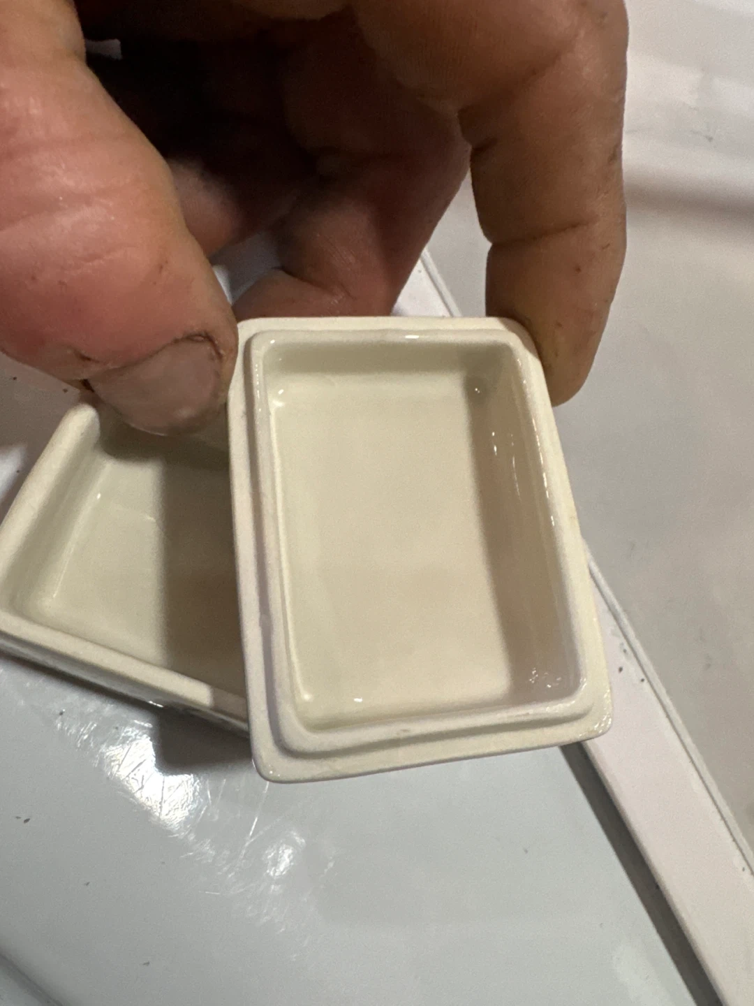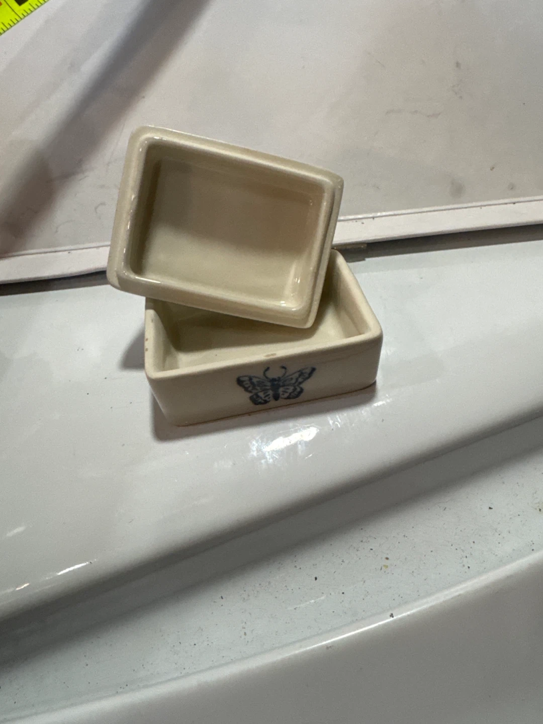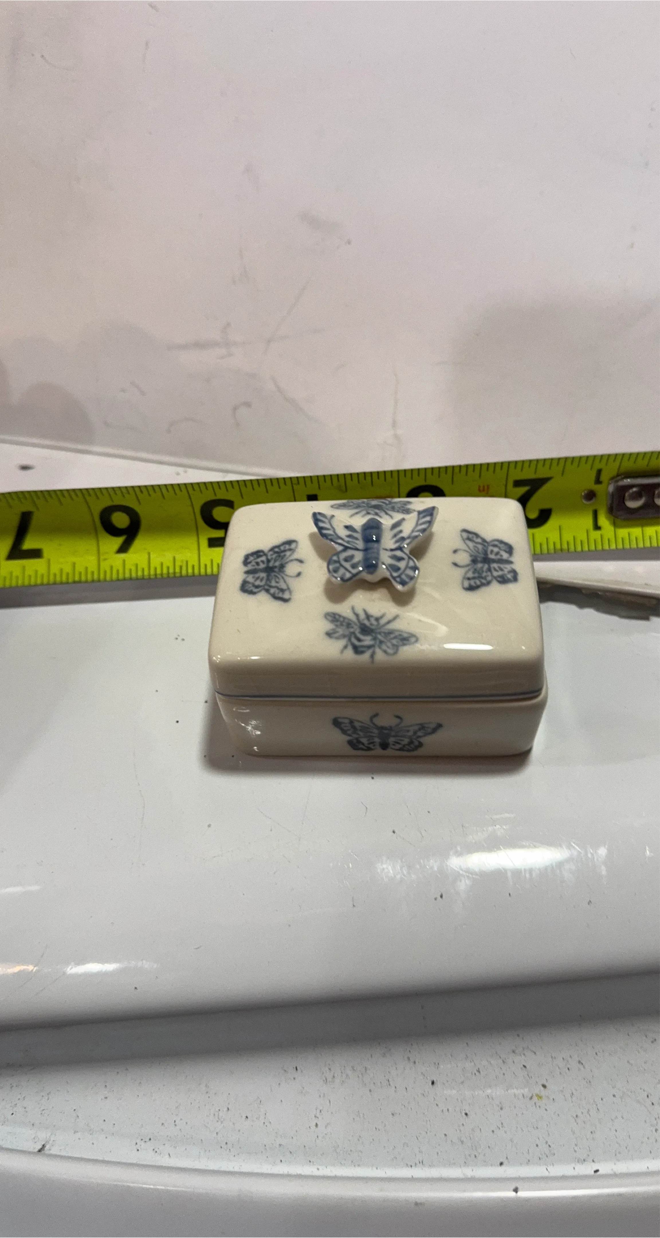 Cute little ceramic trinket box with a butterfly design! It's perfect for storing small jewelry or other precious items. The box has a removable lid with a butterfly on top. It's in good condition, with a few minor signs of wear.