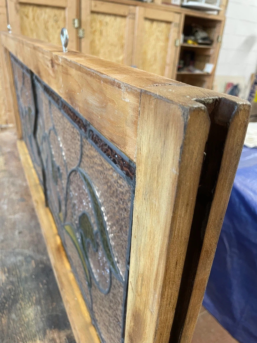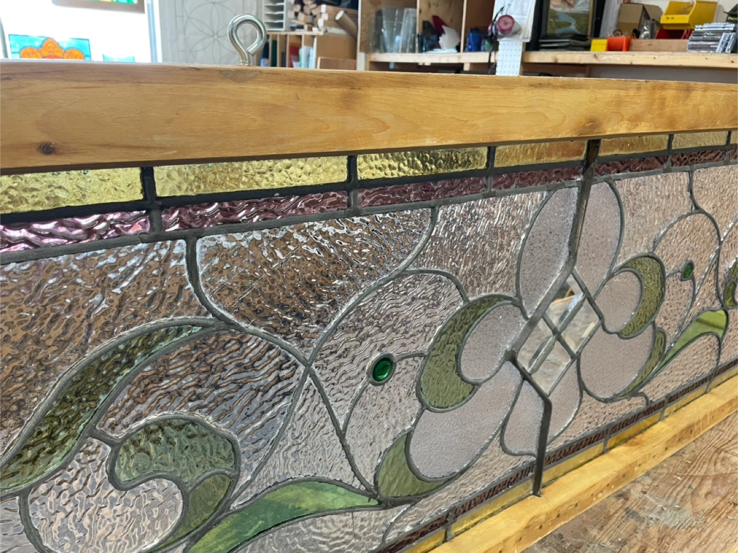 A restored beautiful stained glass window panel with a wooden frame and 2 eye hooks for hanging. The glass features a floral design with green accents. It's in great condition and ready to add a touch of elegance to your home