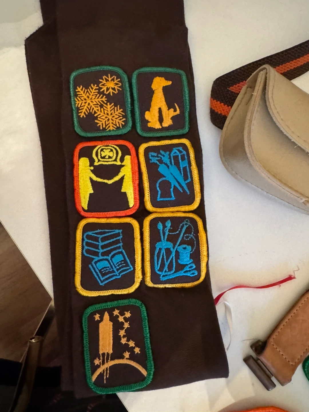 This lot includes a Girl Guide or Brownie program book titled 'The Brownie Program' and a collection of embroidered badges. Also included is a striped bandana and a brown sash with a leatherette tab featuring a clover emblem. The badges cover various activities like baking, crafts, and community service. This set is suitable for young members of scouting organizations looking to track their achievements and participate in programs.