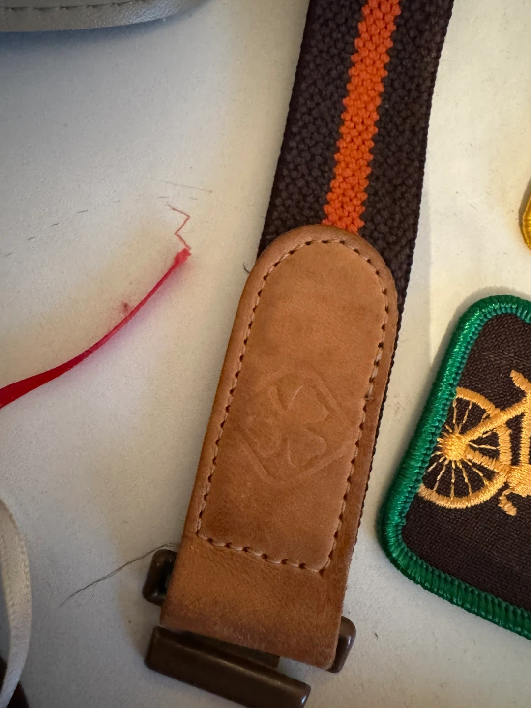 This lot includes a Girl Guide or Brownie program book titled 'The Brownie Program' and a collection of embroidered badges. Also included is a striped bandana and a brown sash with a leatherette tab featuring a clover emblem. The badges cover various activities like baking, crafts, and community service. This set is suitable for young members of scouting organizations looking to track their achievements and participate in programs.