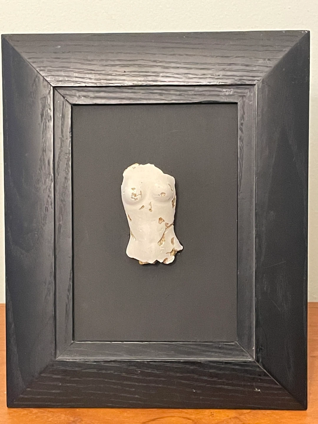 Unique framed plaster torso art piece! This is a striking piece of decor that would add character to any room. The plaster torso is mounted on a black backing and framed in a simple black frame. It's in great condition and ready to hang