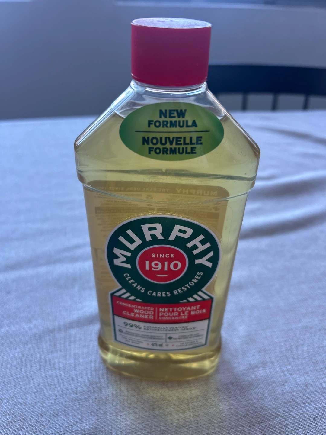 This is a bottle of Murphy Concentrated Wood Cleaner. It's a new formula that cleans, cares for, and restores wood surfaces. It contains 99% naturally derived ingredients and is 473ml.