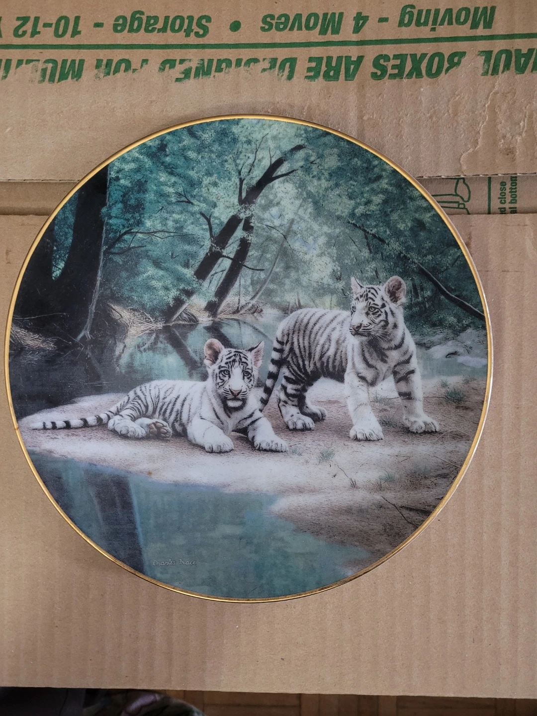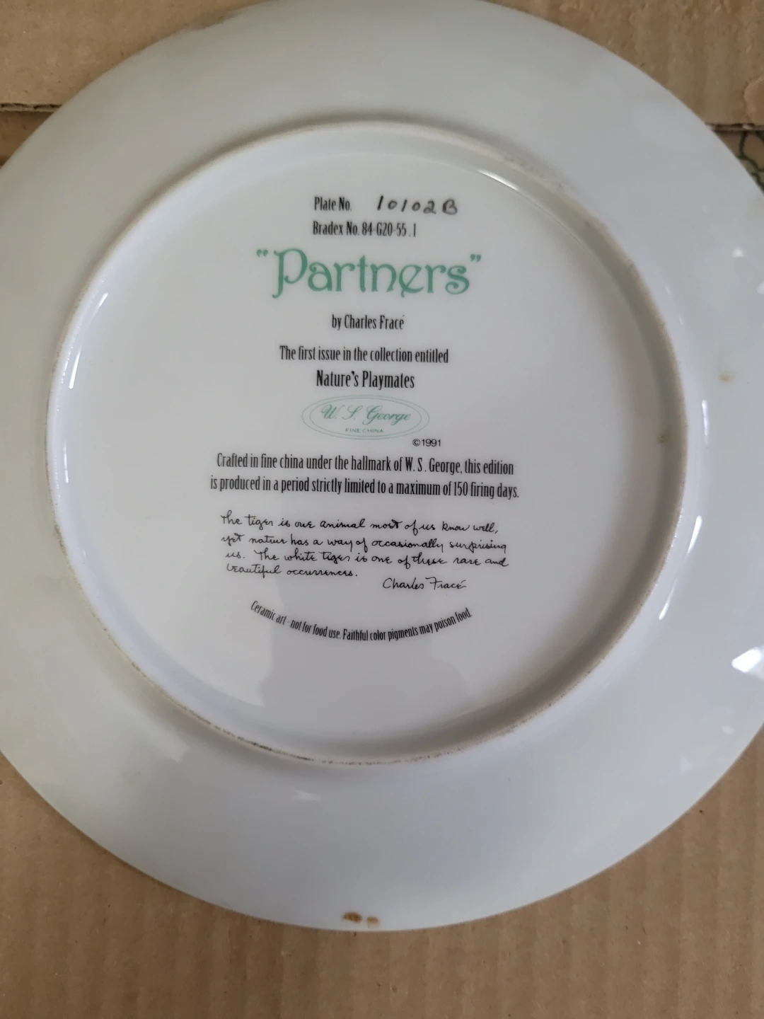This is the first issue in the Nature's Playmates collection, titled 'Partners'. Crafted in fine china by W.S. George under the hallmark. The plate features a painting of two white tiger cubs by Charles Fracé.