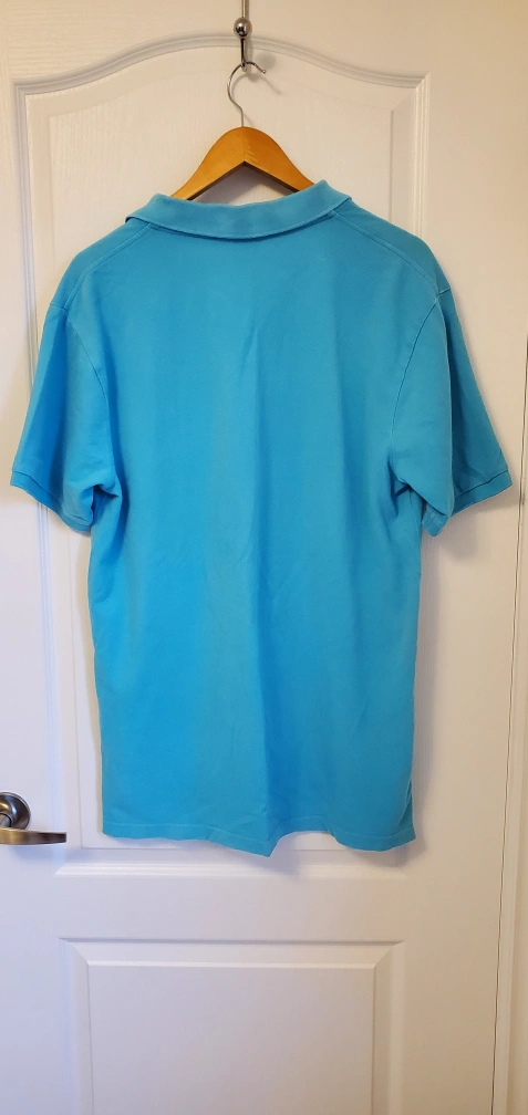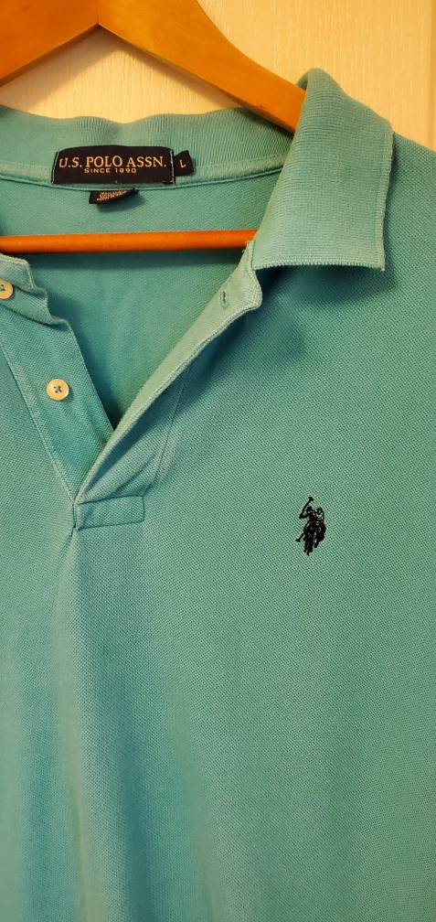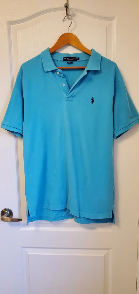 A blue short-sleeved polo shirt from U.S. Polo Assn. with a black embroidered logo on the left chest. The shirt is size Large.