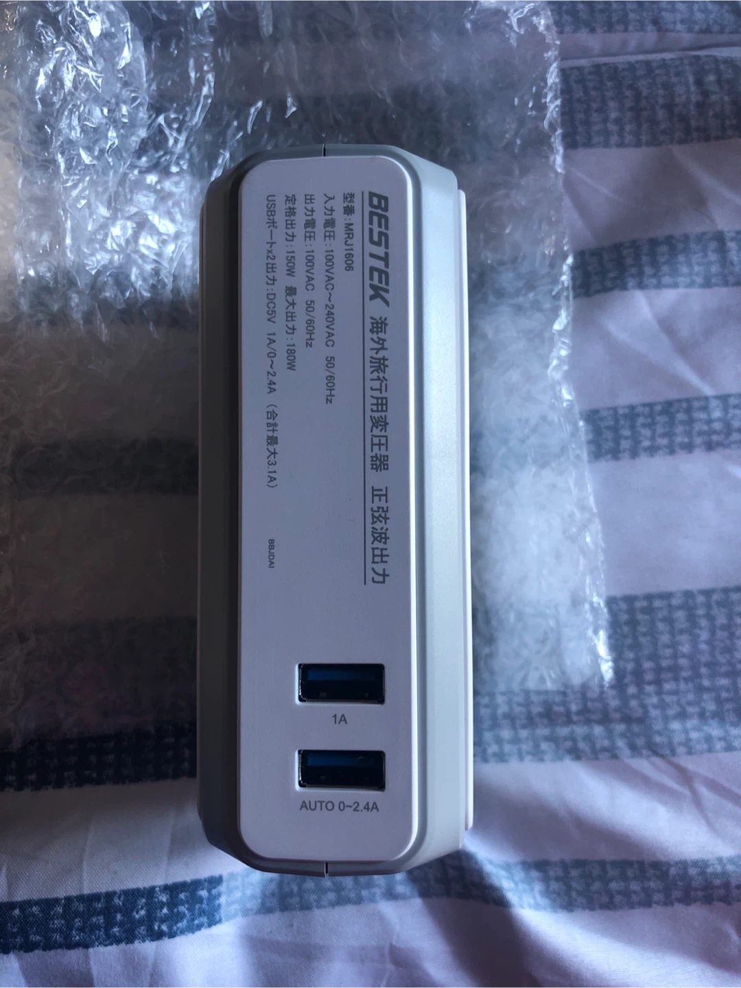 This BESTEK international travel voltage converter is designed for overseas travel. It features two USB ports for charging devices. The input is 100-240VAC, 50/60Hz, and the output is 150W max/180W max. It also offers USB outputs of 5V/1A and AUTO 0-2.4A. This converter is great for use while travelling abroad!