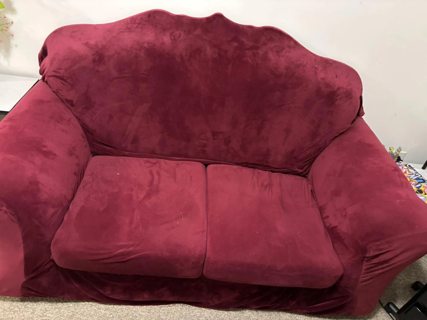 This burgundy velvet sofa offers a plush seating experience. It's designed with comfortable cushions and elegant rolled arms. Adds a cozy touch to any living space!