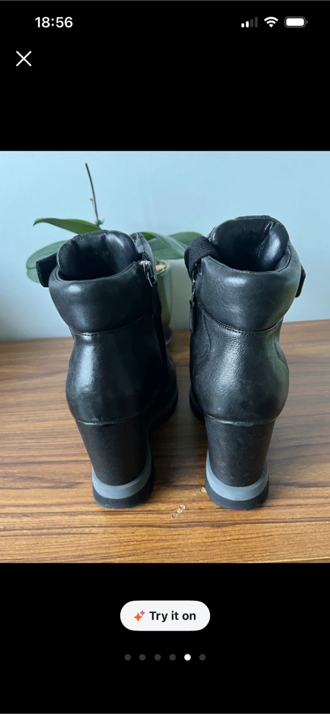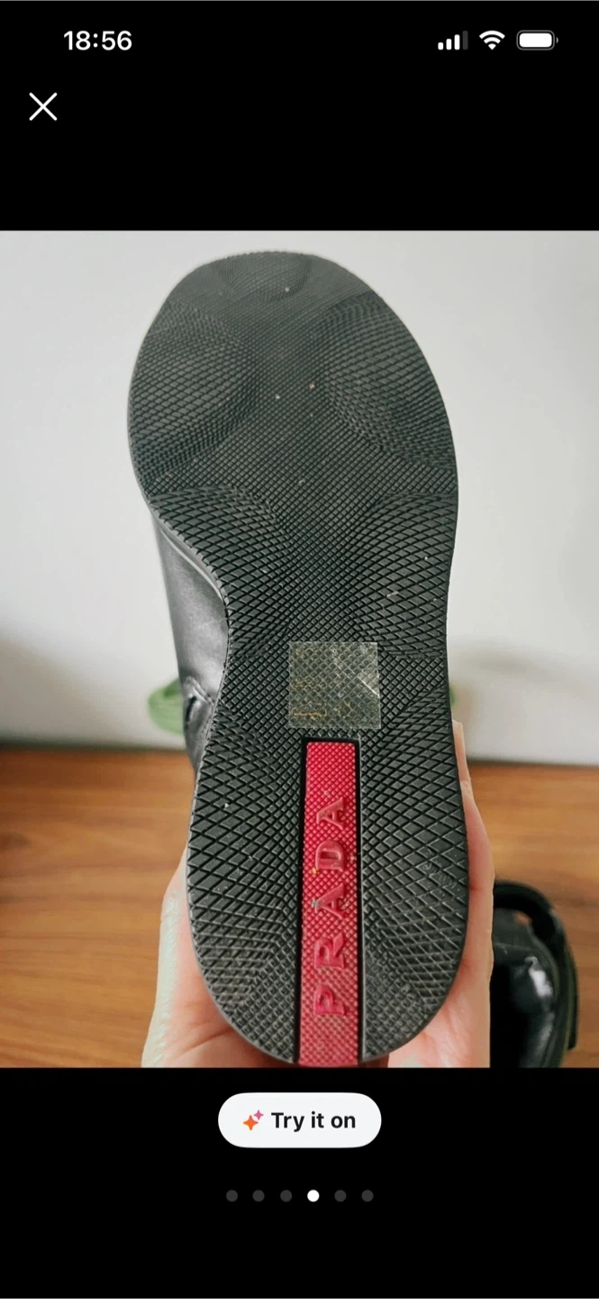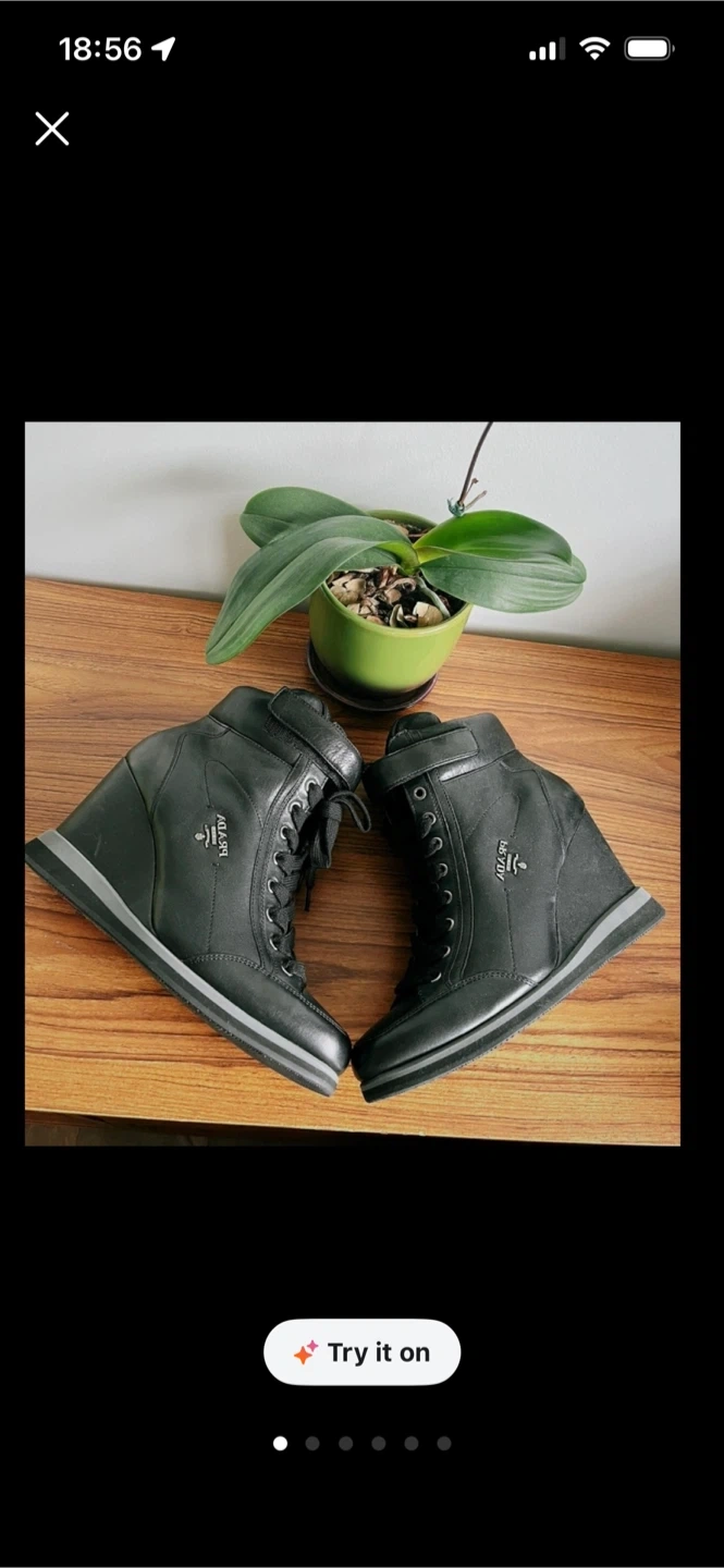 Selling a pair of Prada wedge sneakers in black leather. They are a size 38. These stylish sneakers feature a wedge heel and lace-up design, perfect for adding a bit of edge to your outfits specially this winter ❄️