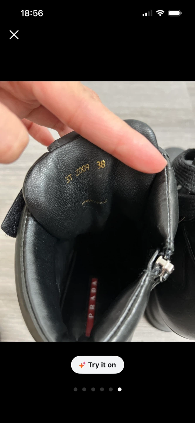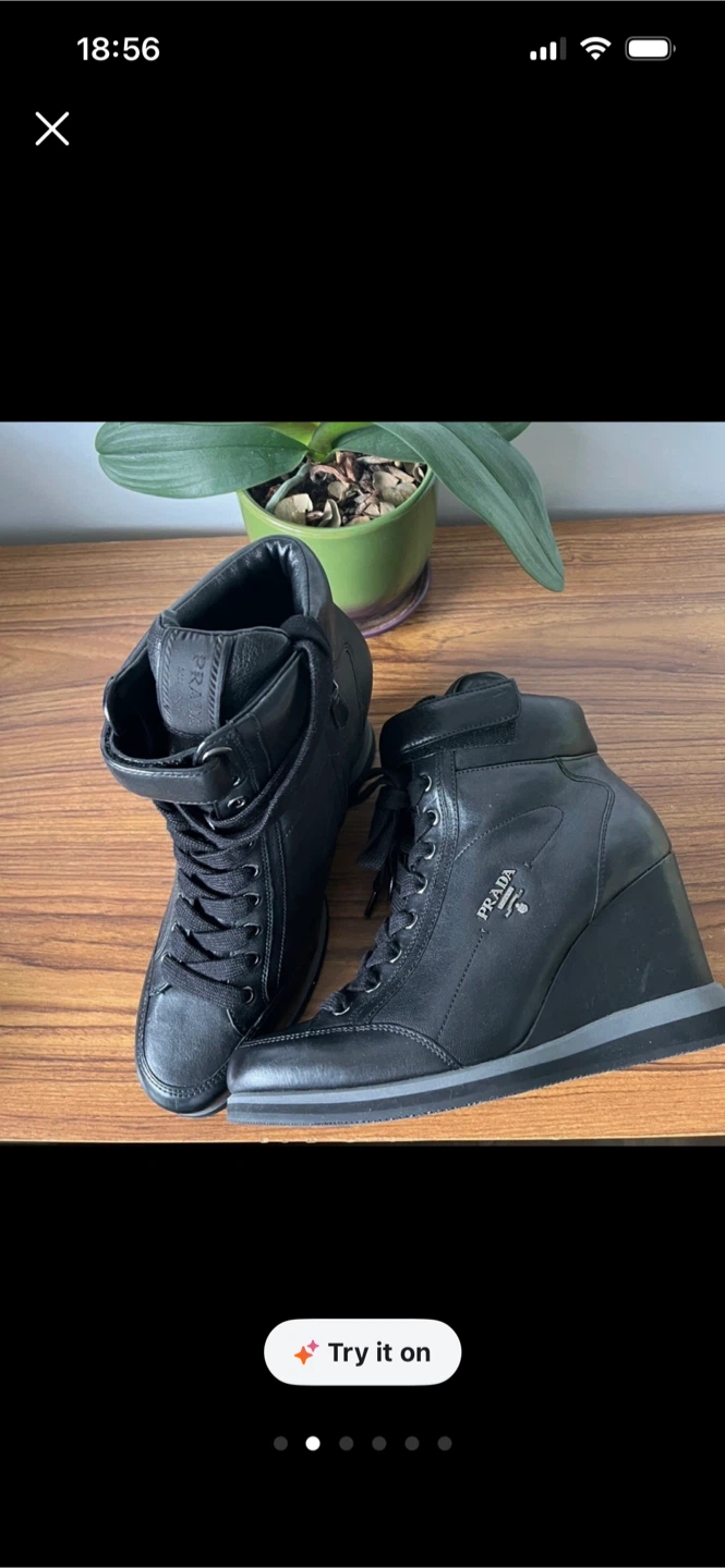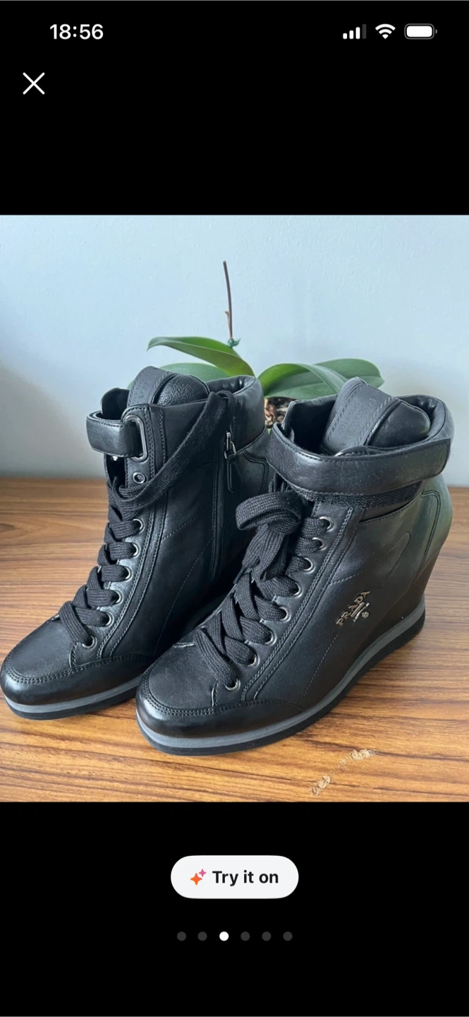 Selling a pair of Prada wedge sneakers in black leather. They are a size 38. These stylish sneakers feature a wedge heel and lace-up design, perfect for adding a bit of edge to your outfits specially this winter ❄️