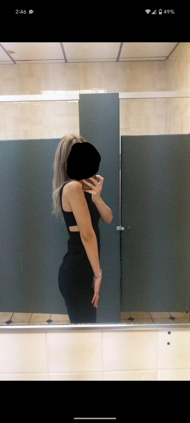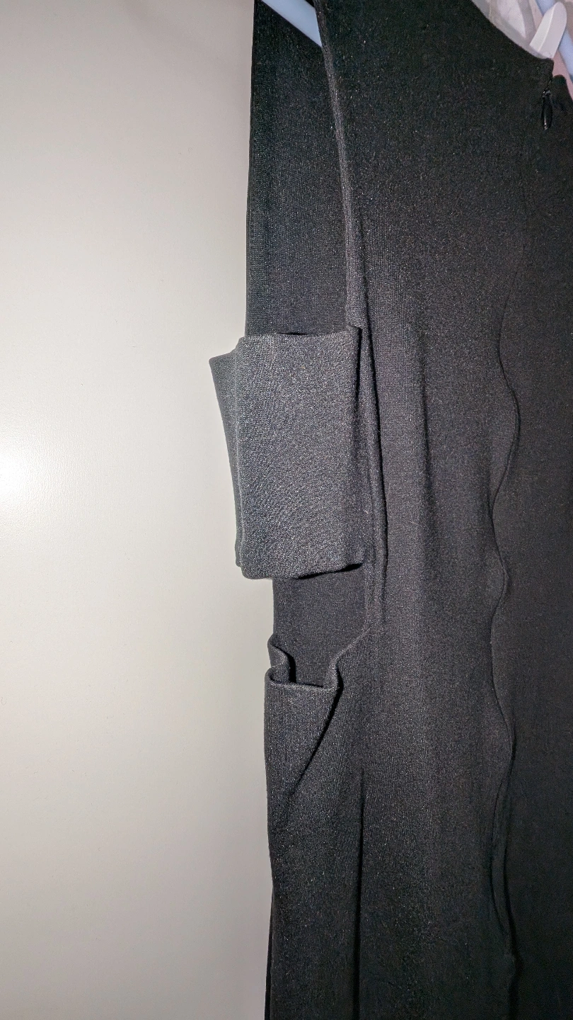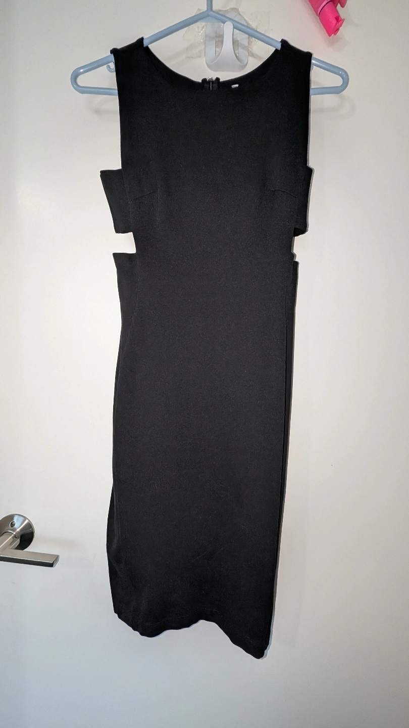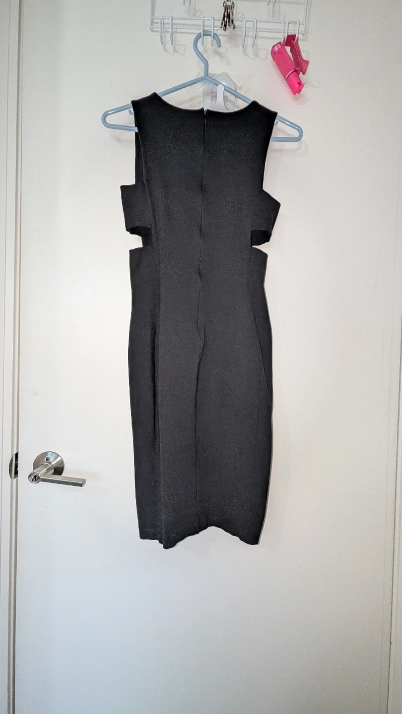 Form-fitting mini dress. Black colour. Cut-outs on the sides. Back zipper closure. Thick material. Great for a night out.