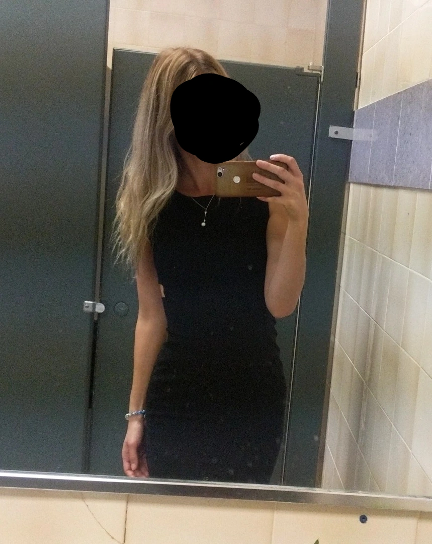 Form-fitting mini dress. Black colour. Cut-outs on the sides. Back zipper closure. Thick material. Great for a night out.
