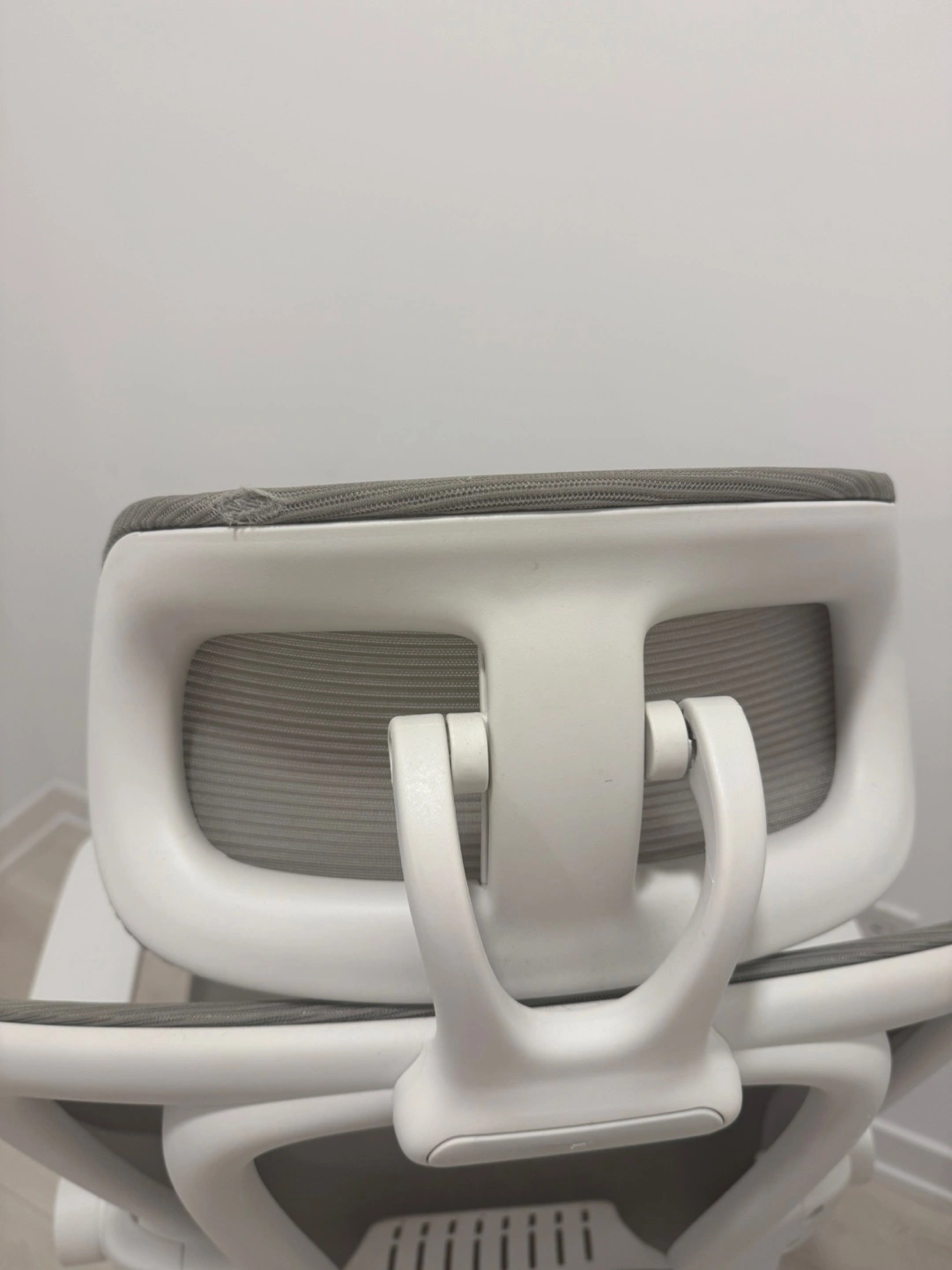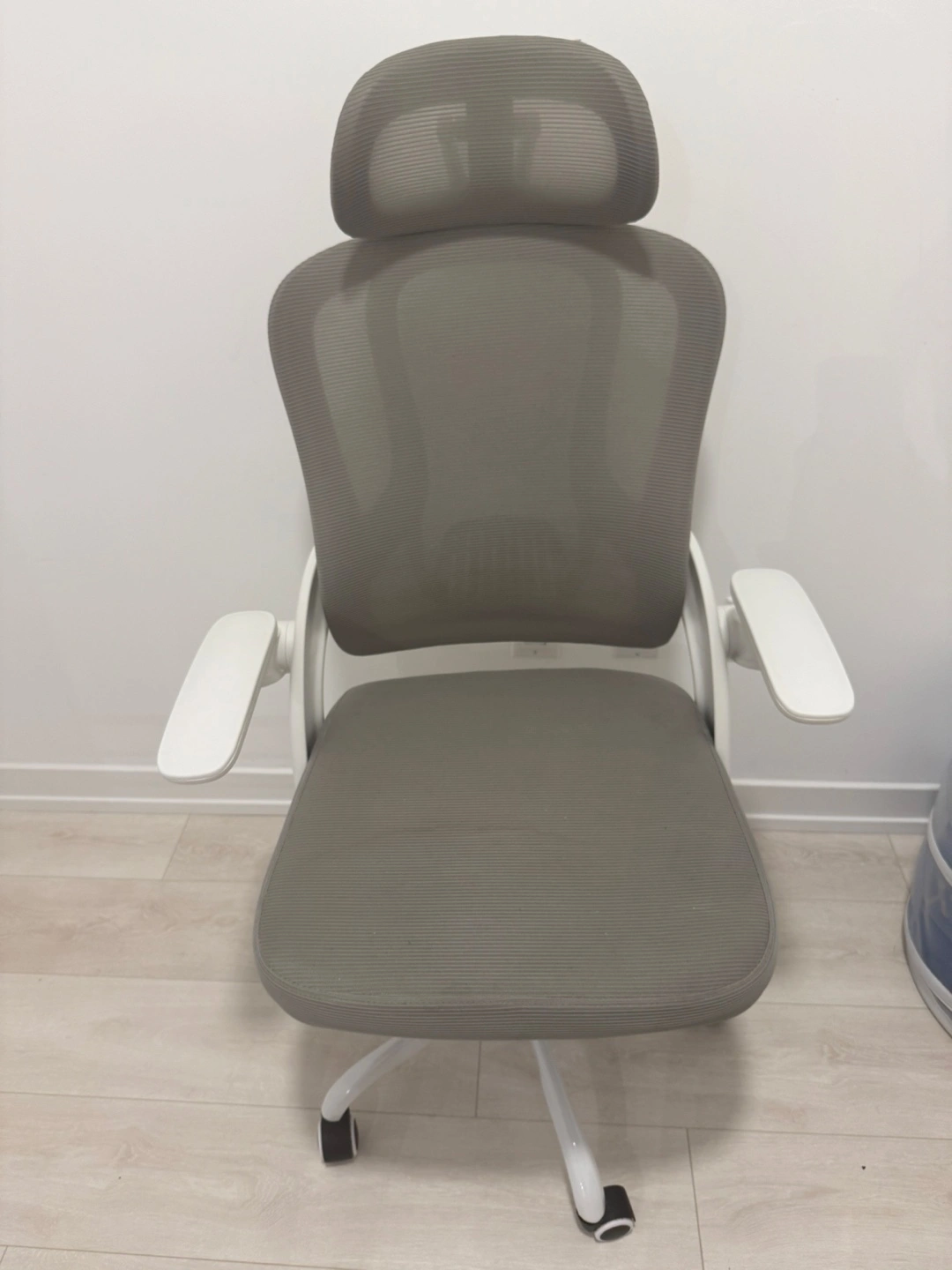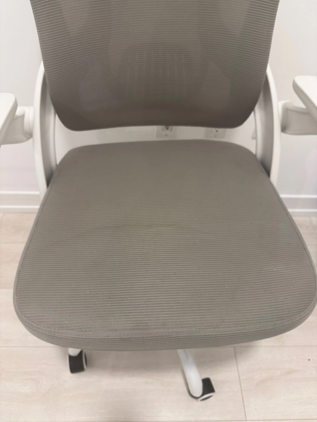Comfortable ergonomic chair. Mesh back and seat. Adjustable height. White armrests. Great for home or office. Water stain on seat and a small tear behind headrest.