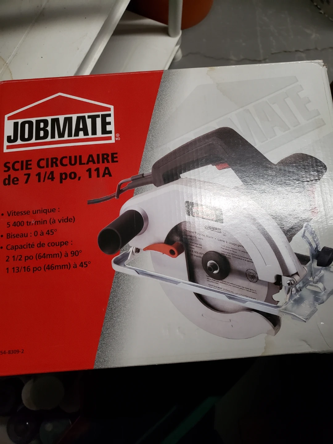 This is a new Jobmate circular saw. It features a no-load speed of 5400 RPM. The bevel capacity is 0 to 45 degrees. It has a cutting depth of 2 1/2" (64mm) at 90 degrees and 1 13/16" (46mm) at 45 degrees.
