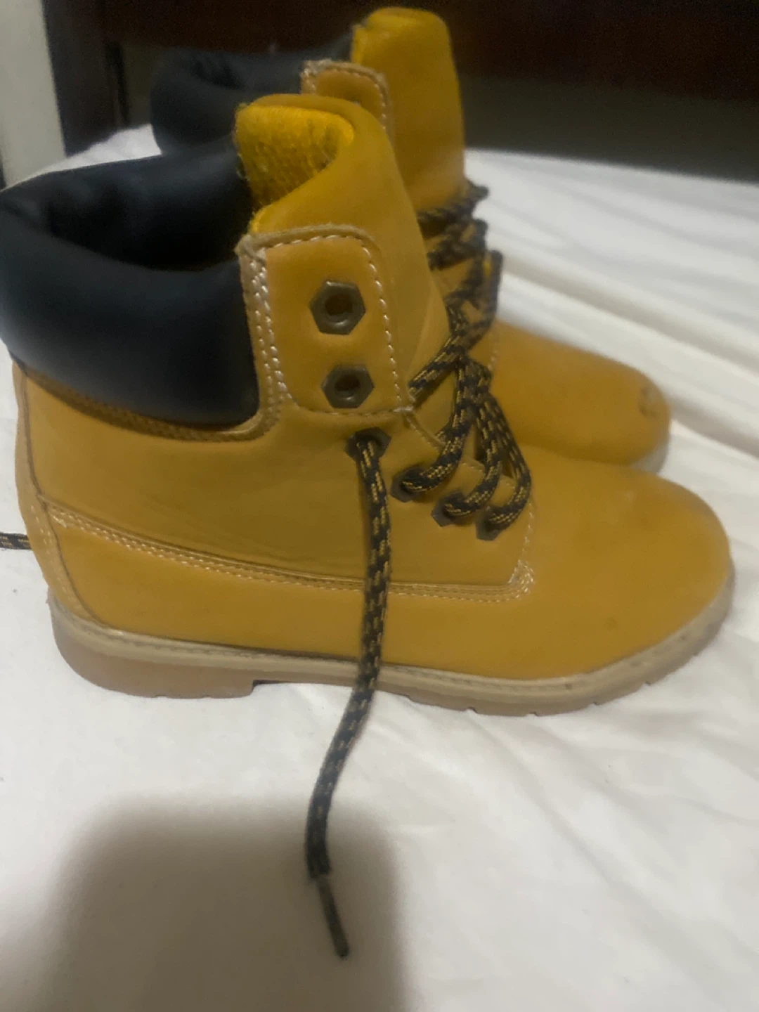 Classic yellow lace-up boots with black padded collars. These boots feature durable rubber soles and stylish patterned laces. Perfect for keeping feet warm and protected!