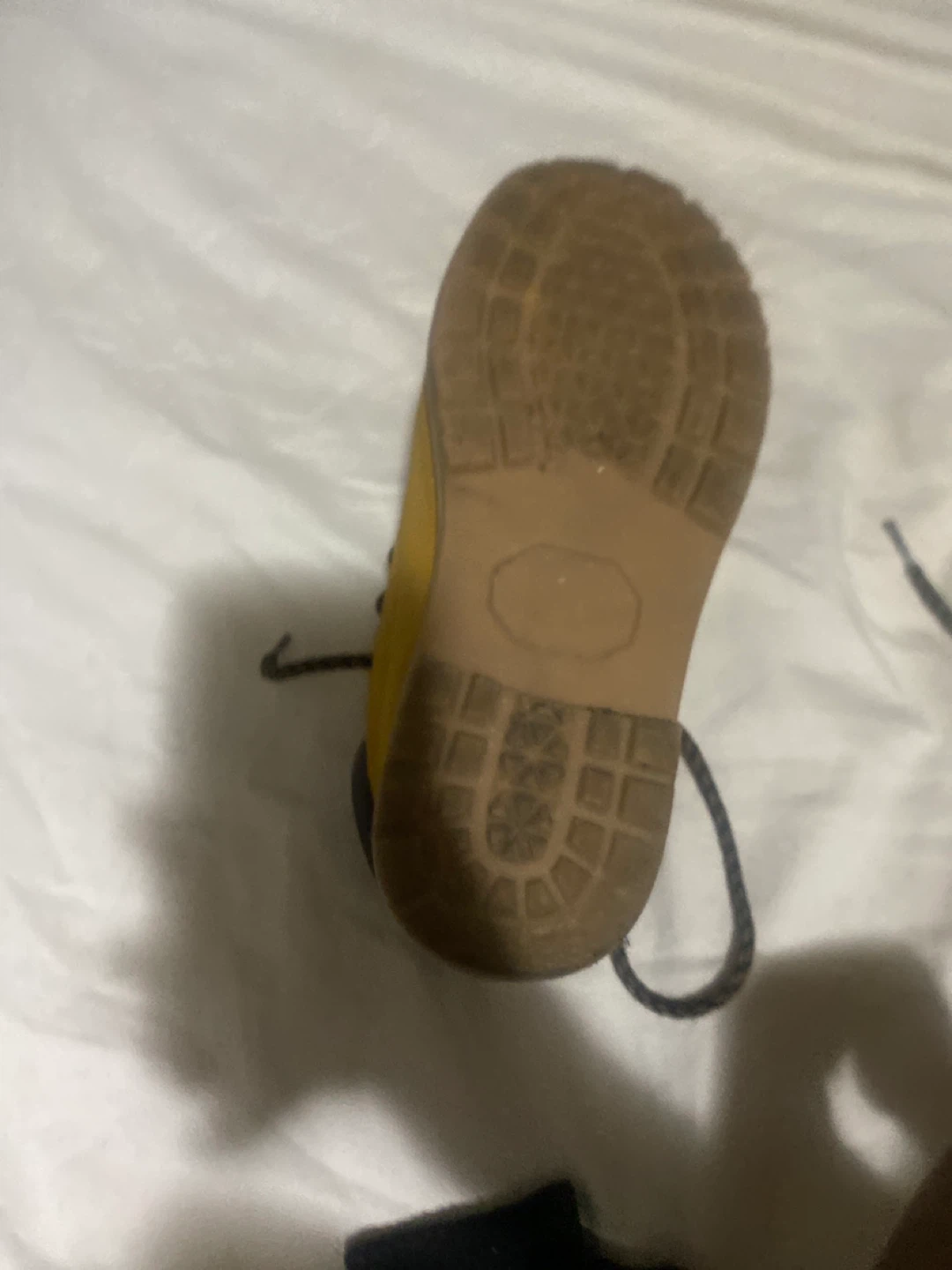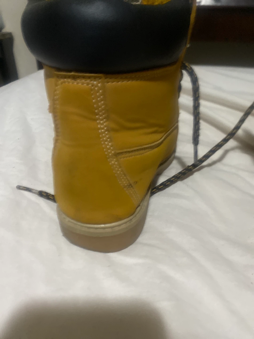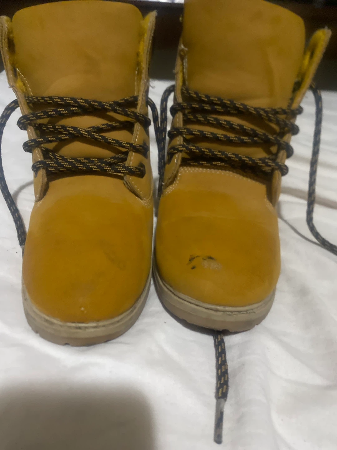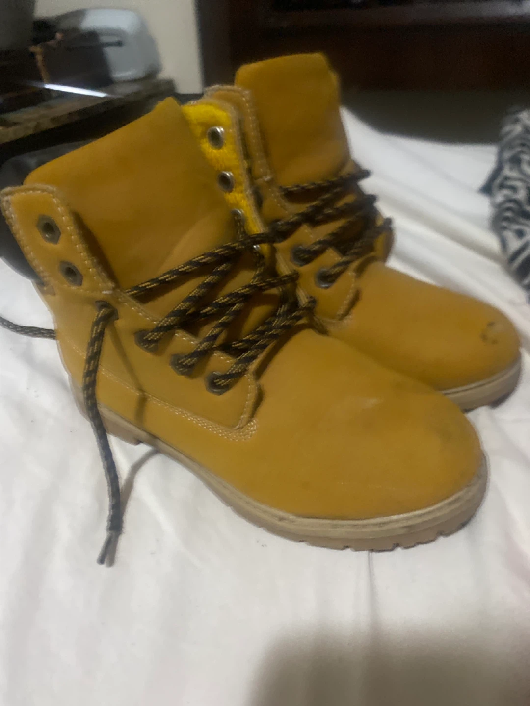 Classic yellow lace-up boots with black padded collars. These boots feature durable rubber soles and stylish patterned laces. Perfect for keeping feet warm and protected!