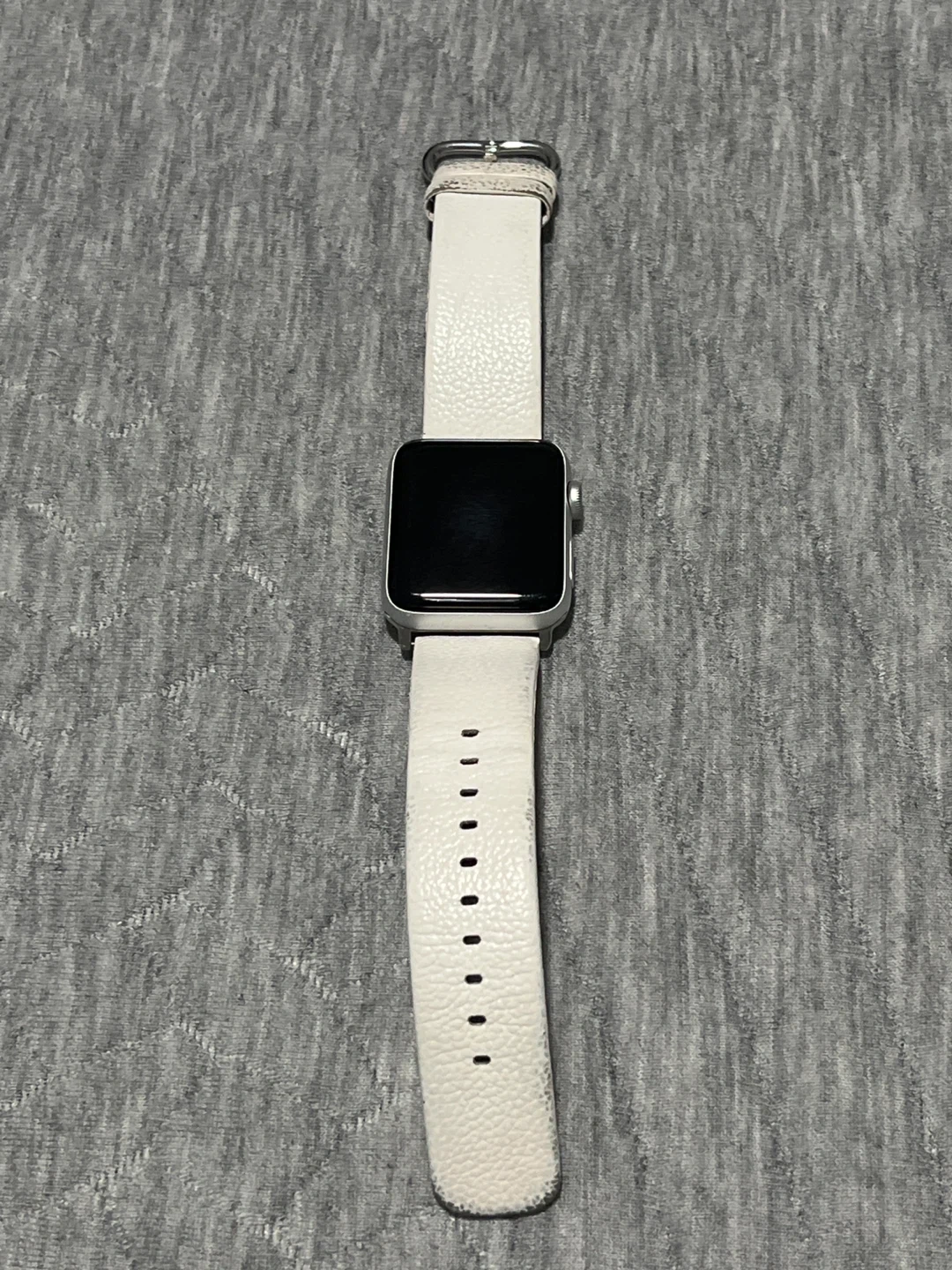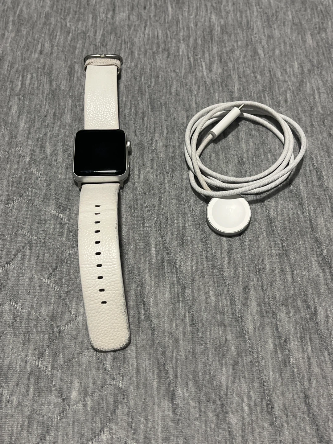 This is an Apple Watch Series 2 in silver aluminum. It comes with a white leather band and its charging puck. It's a great smartwatch for everyday use.