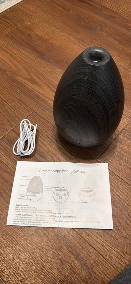 Sleek Sharper Image aromatherapy misting diffuser with a cool wood grain design. Comes with USB cable and instruction manual. Water capacity 180 ml, covers 300-400 sq ft area. Runs for 2-3 hours. Great for relaxing vibes. Box was not even opened. Brand new. Pick up in Acadia, SE.