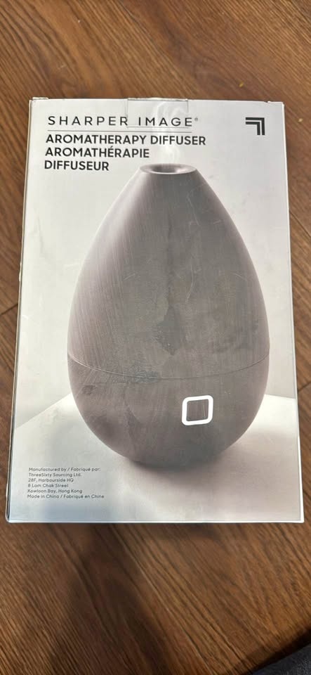 Sleek Sharper Image aromatherapy misting diffuser with a cool wood grain design. Comes with USB cable and instruction manual. Water capacity 180 ml, covers 300-400 sq ft area. Runs for 2-3 hours. Great for relaxing vibes. Box was not even opened. Brand new. Pick up in Acadia, SE.