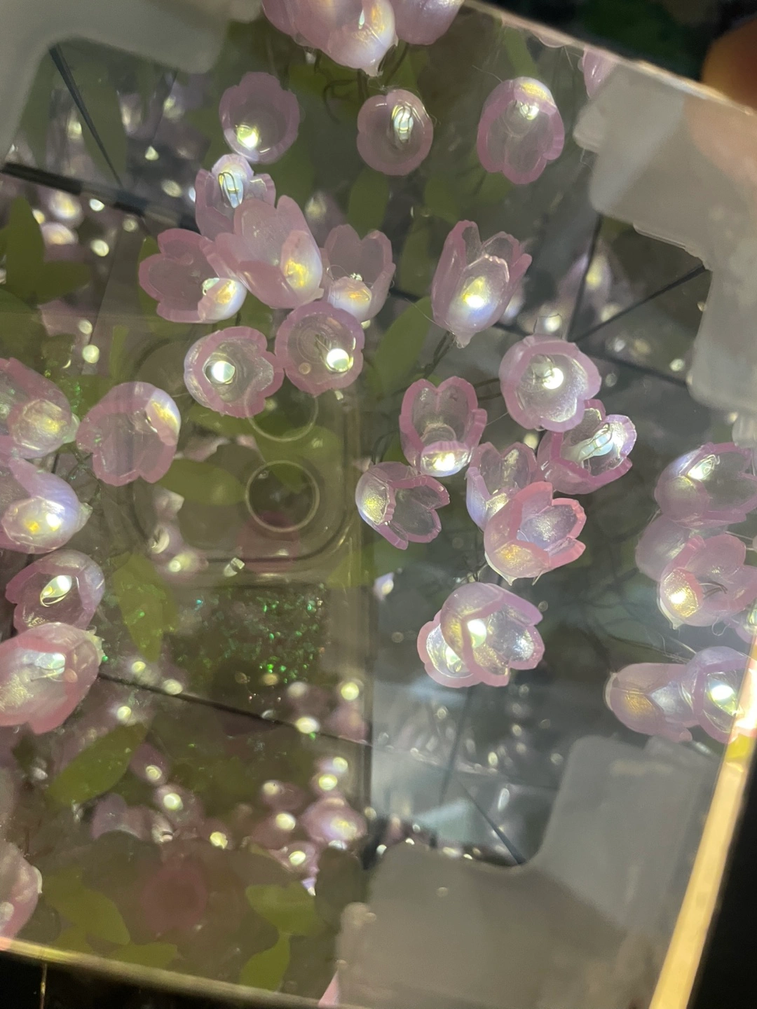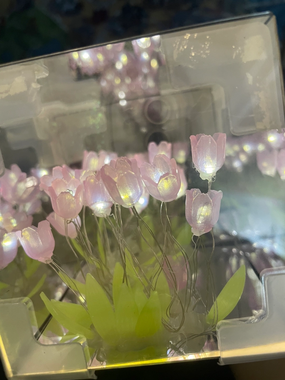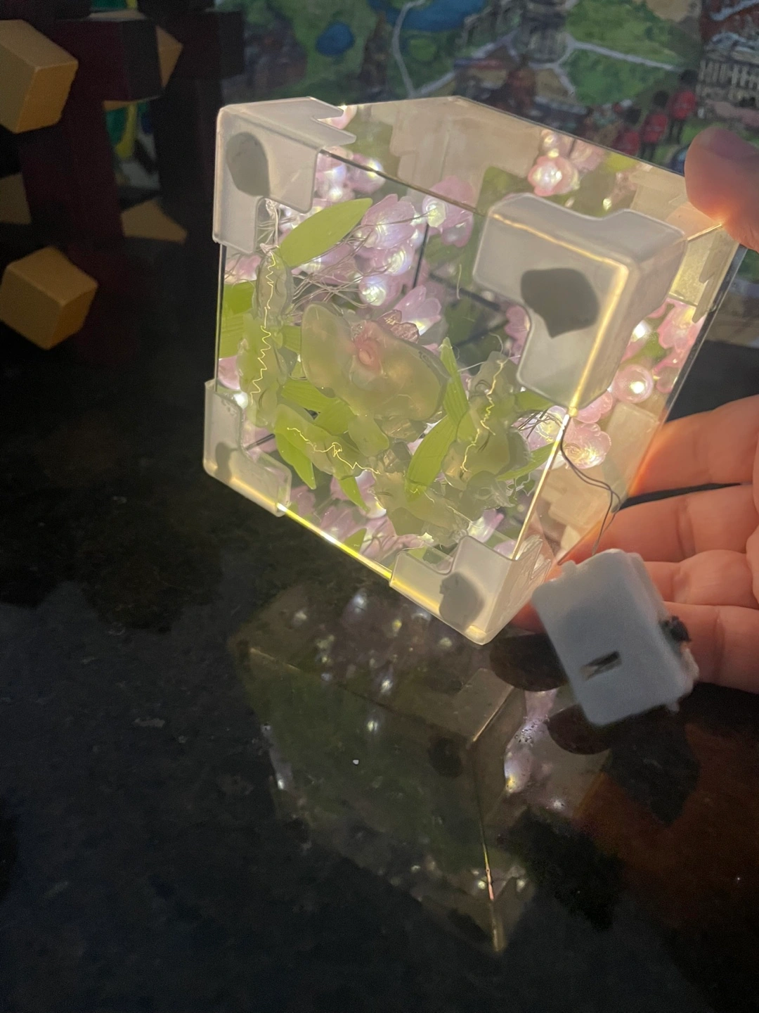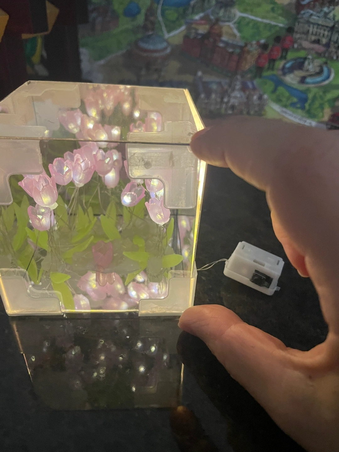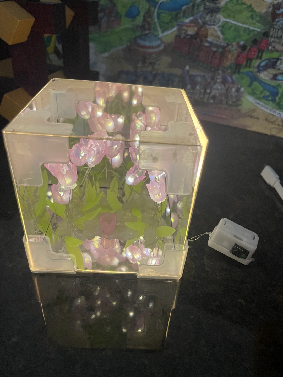 Cute light-up cube. Features pink flowers and green leaves. Battery operated. Adds a touch of whimsy to any space.