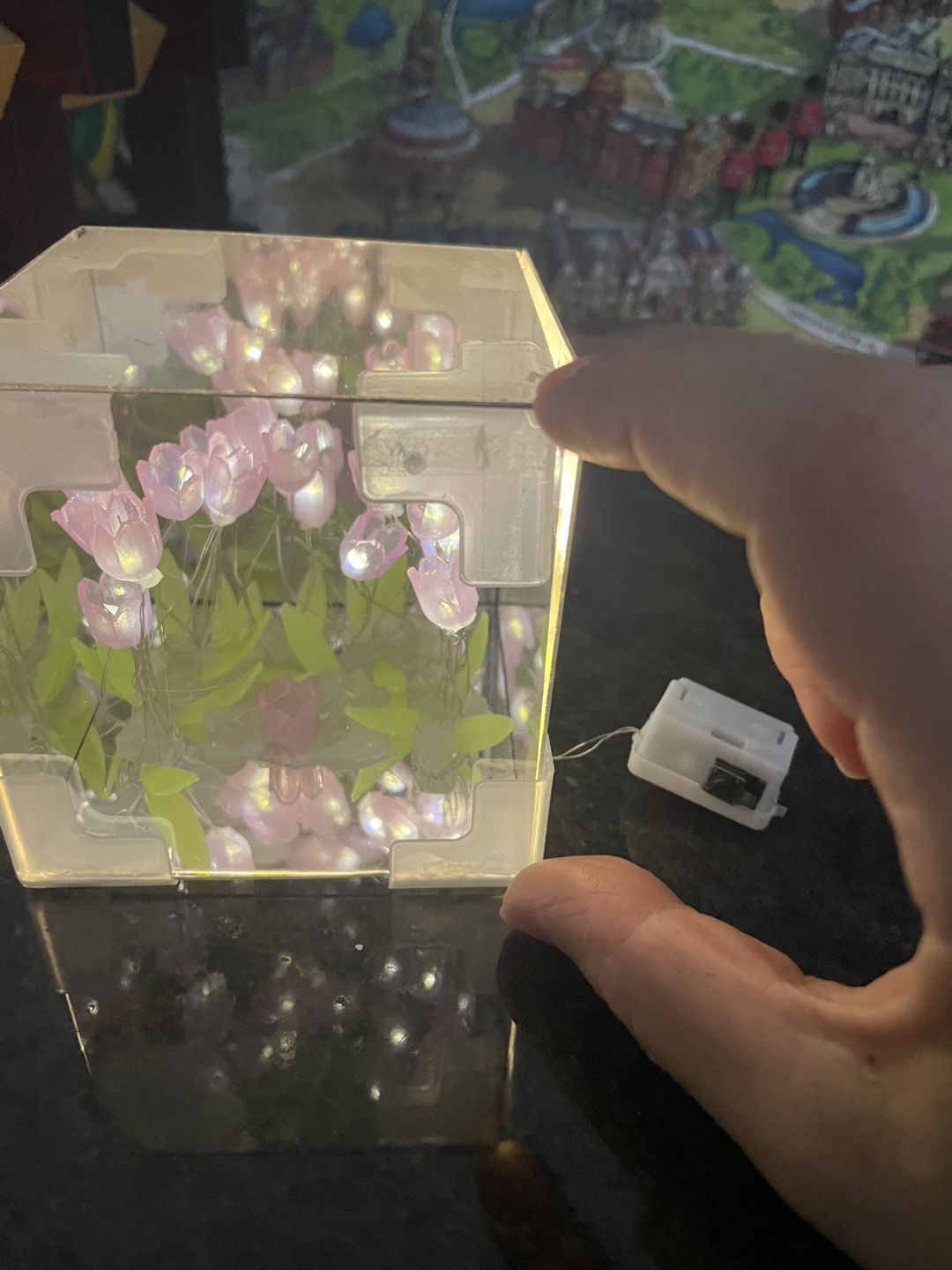 Cute light-up cube. Features pink flowers and green leaves. Battery operated. Adds a touch of whimsy to any space.