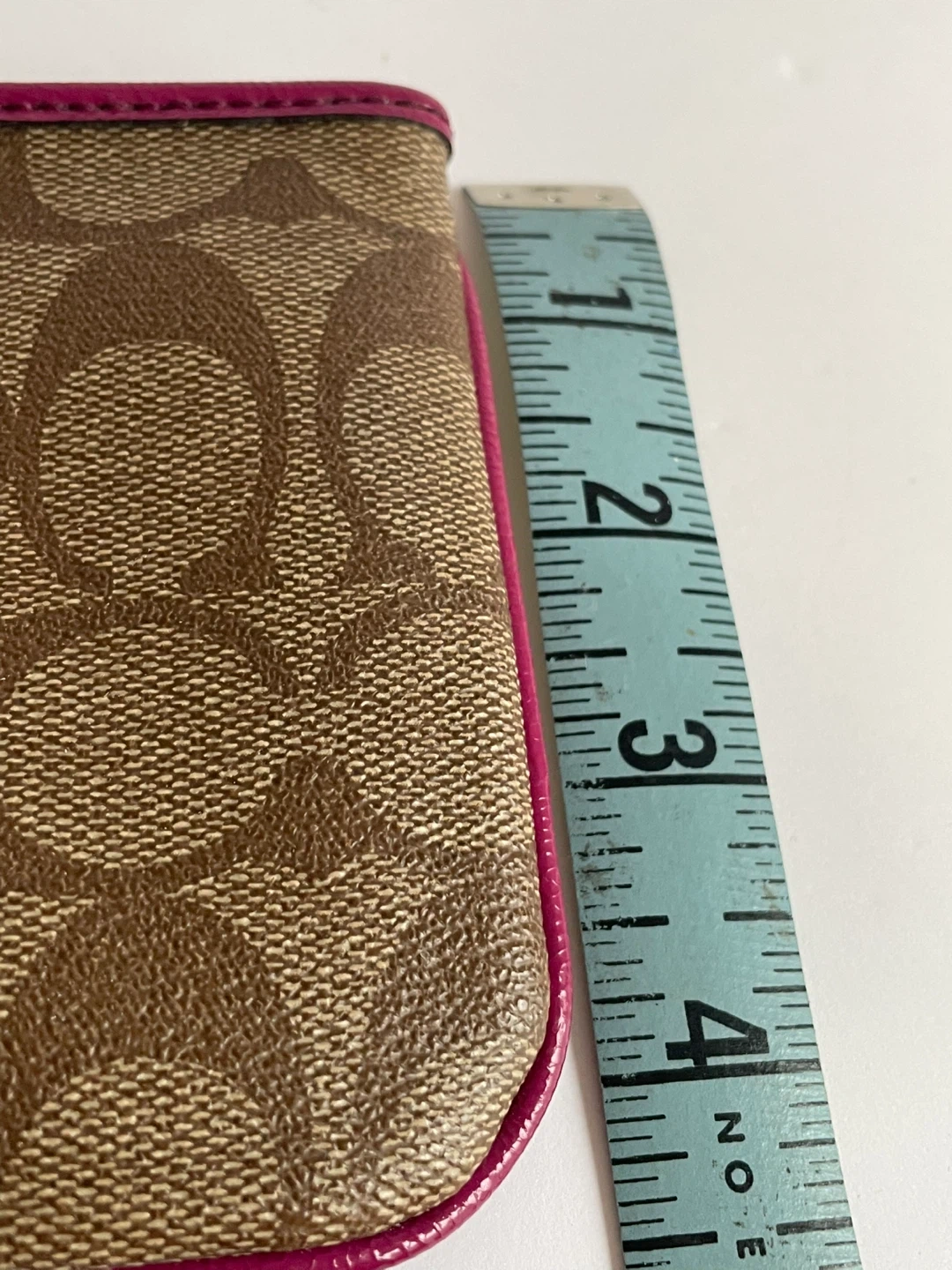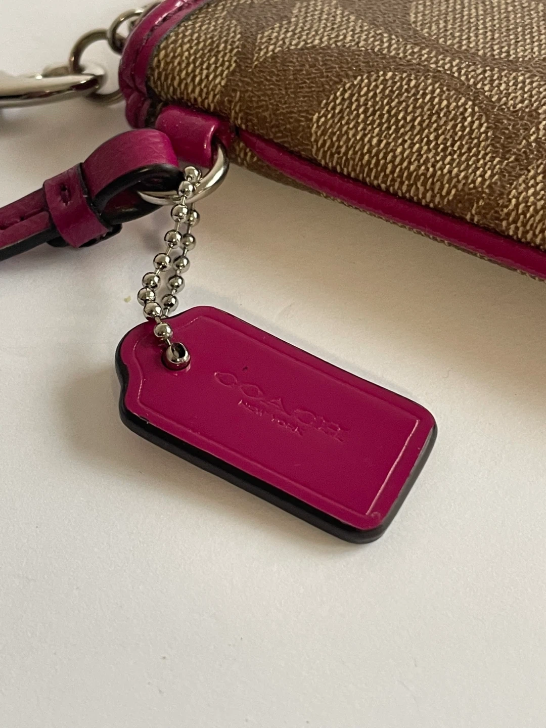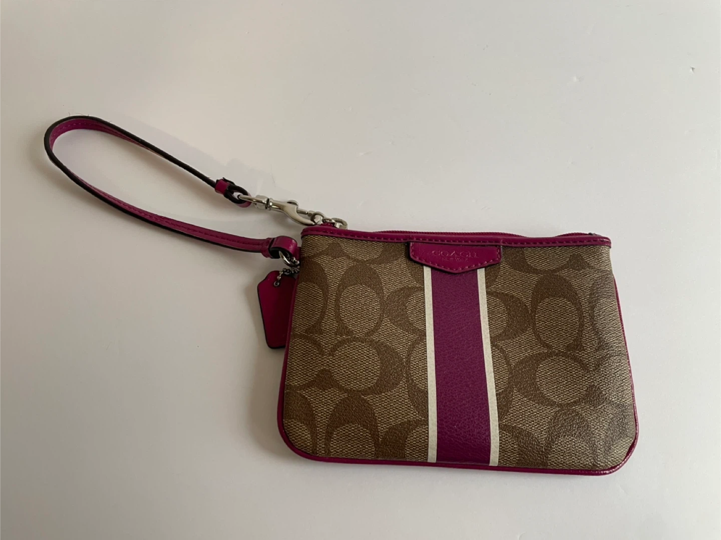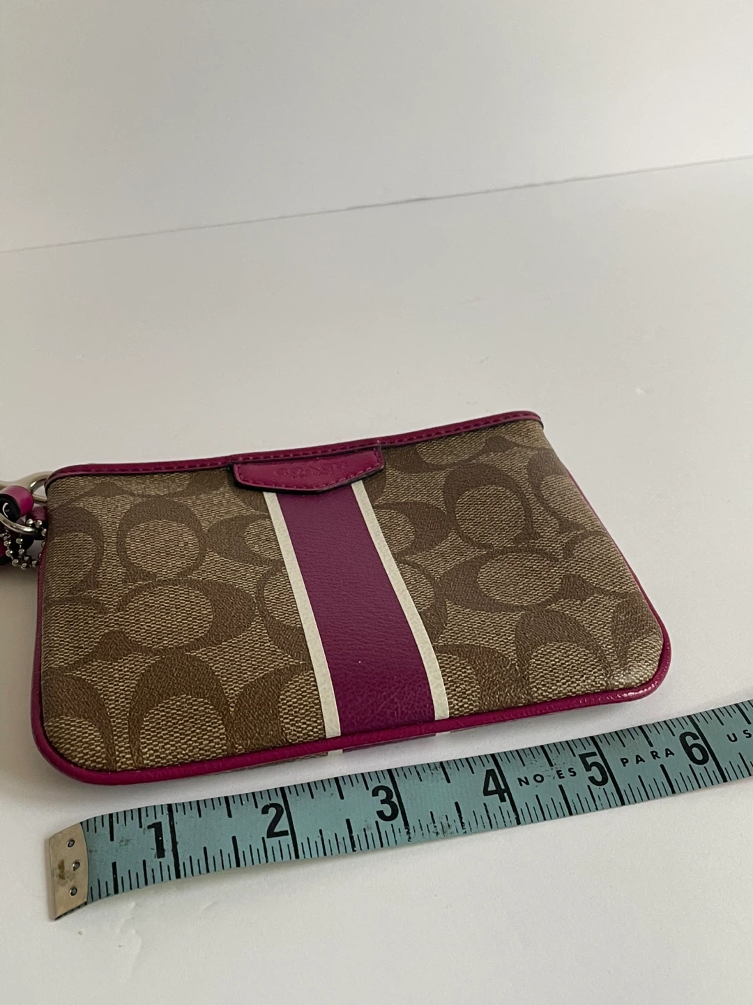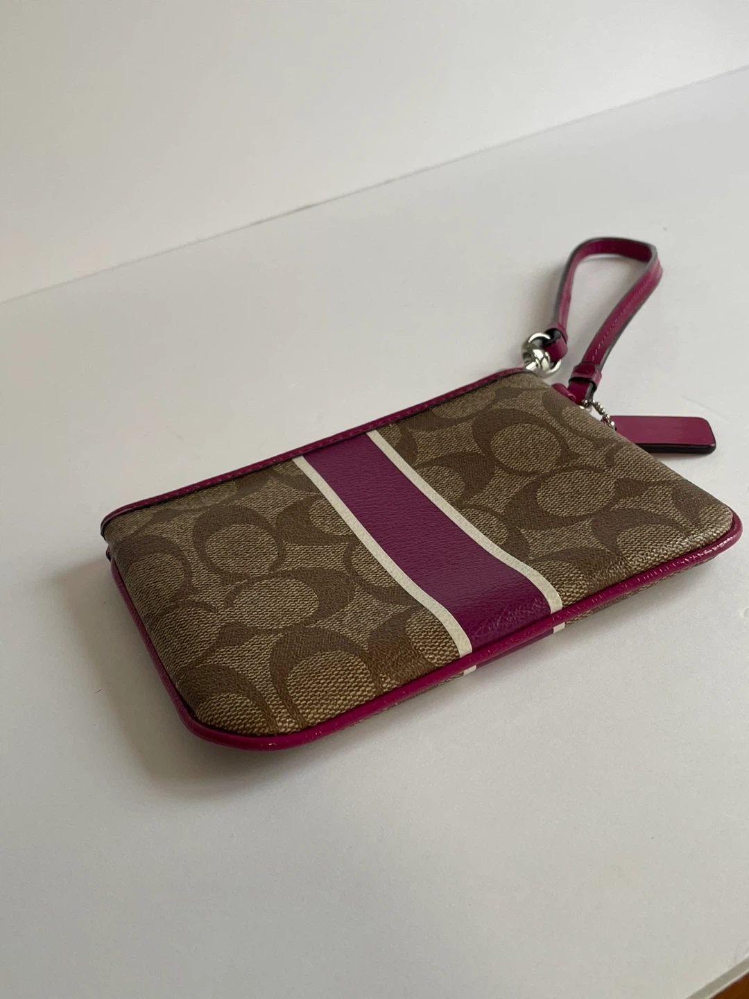Selling a cute Coach wristlet purse! It features the signature Coach pattern with a pink accent stripe and trim. The size is approximately 6 inches wide and 4 inches tall. Great for carrying your essentials!