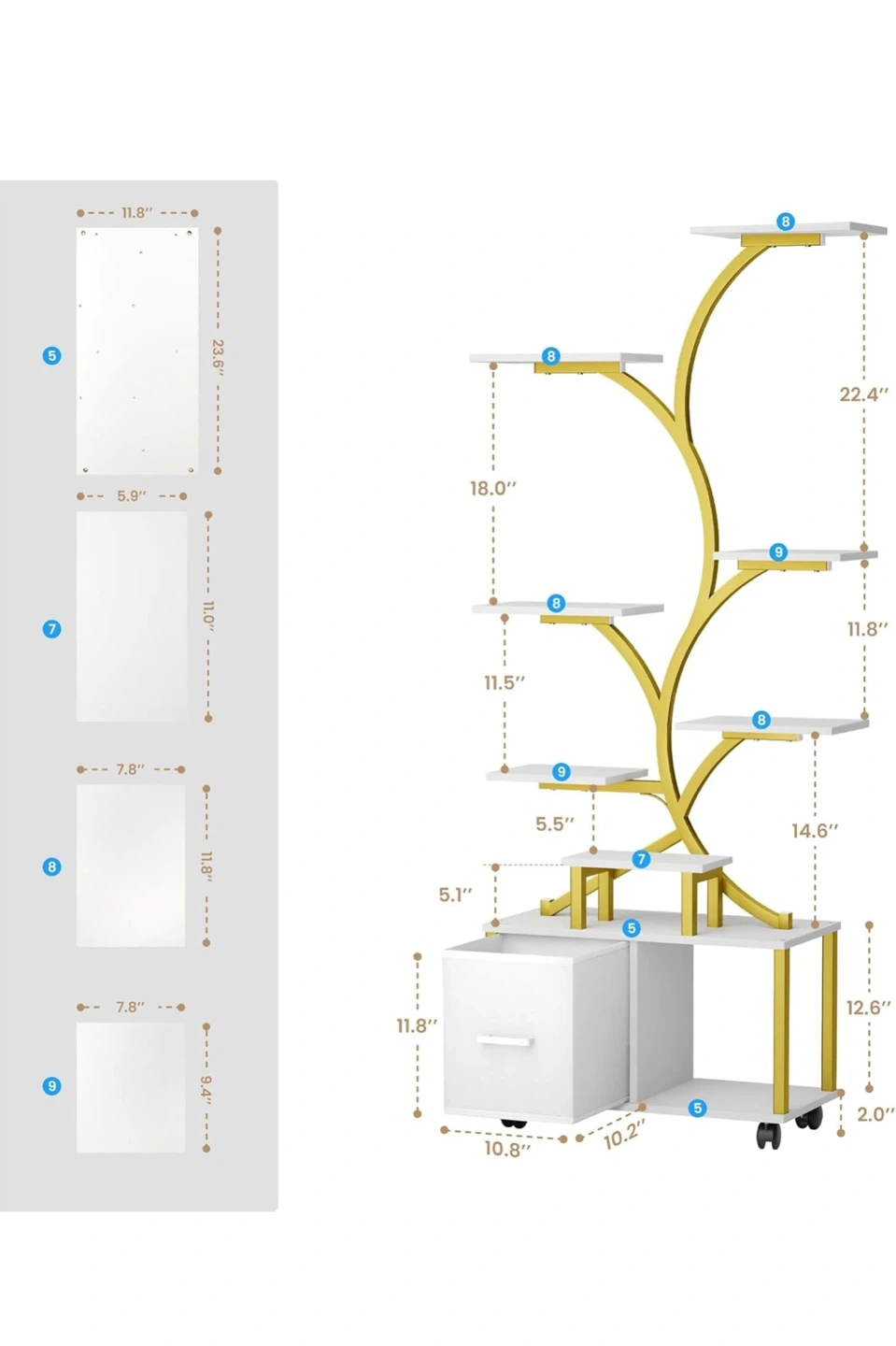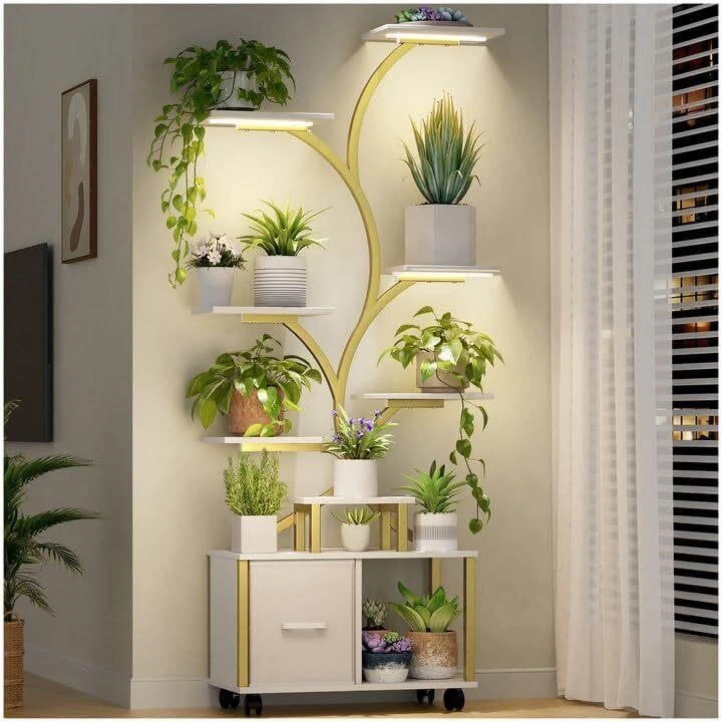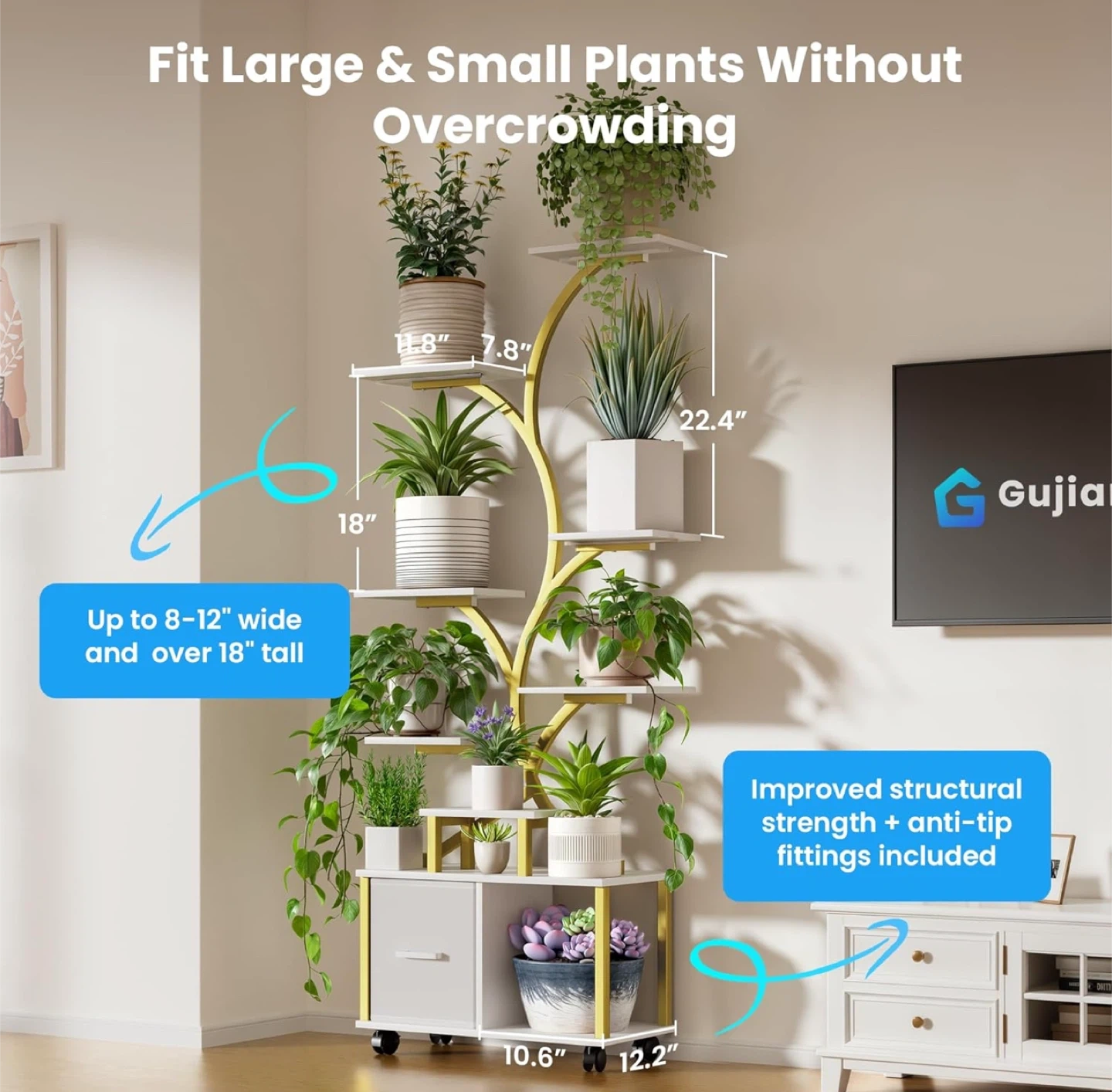 I'm selling a Gujjiam plant stand with a built-in grow light. It's perfect for both large and small plants, helping them thrive day or night. The stand features a white and gold finish, adding a touch of elegance to any room. It also includes anti-tip fittings for improved structural strength. The dimensions are approximately 12.2" x 10.6" at the base, with shelves ranging from 7.8" x 11.8" to 18" x 11.8".
