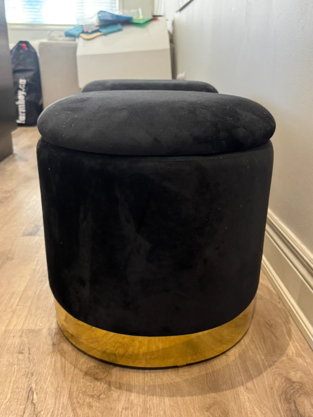 These round storage ottomans are upholstered in soft black velvet with a stylish gold base. They offer hidden storage space inside, perfect for small items. Includes assembly instructions.
