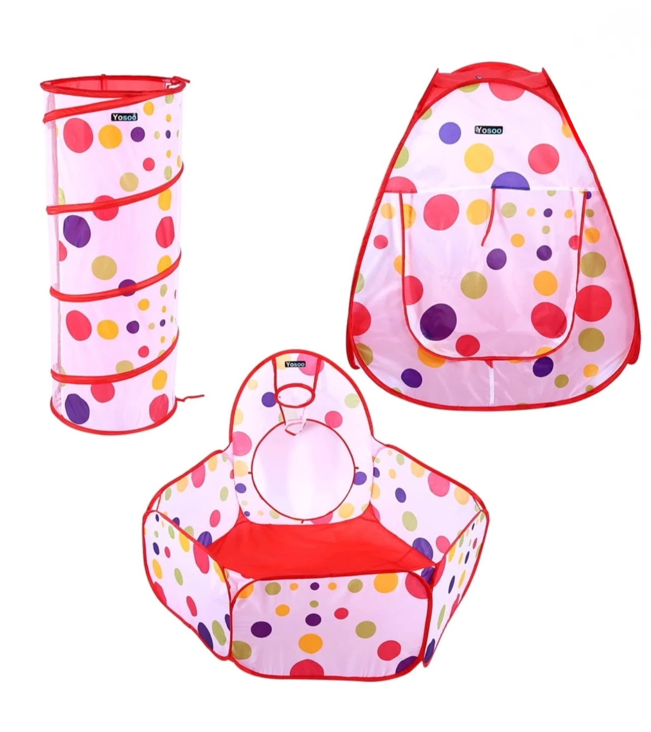 This play tent set is perfect for keeping the little ones entertained! It includes a tent, tunnel, and ball pit, all in a fun and colourful polka dot design. It's great for indoor or outdoor play and provides hours of fun!