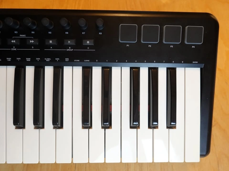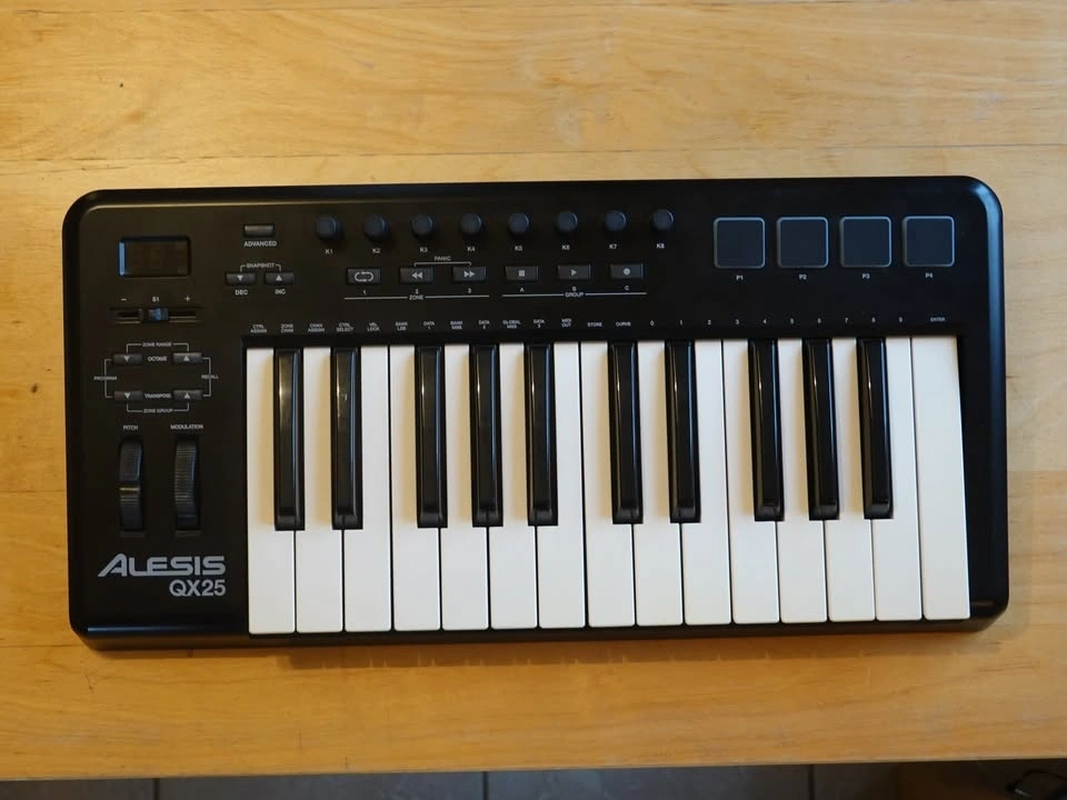 Alesis QX25 - Two-octave (25-key) touch-sensitive (with Aftertouch) USB MIDI keyboard, with pitch and modulation wheels, record/playback functionality, transpose, four velocity-sensitive drum pads, and 8 programmable dials.
