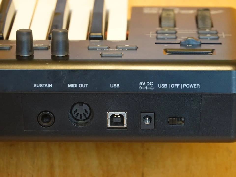 Connections: 1/4” TS Sustain pedal, 5-Pin MIDI Out, USB (type B), 5V 100mA DC input.