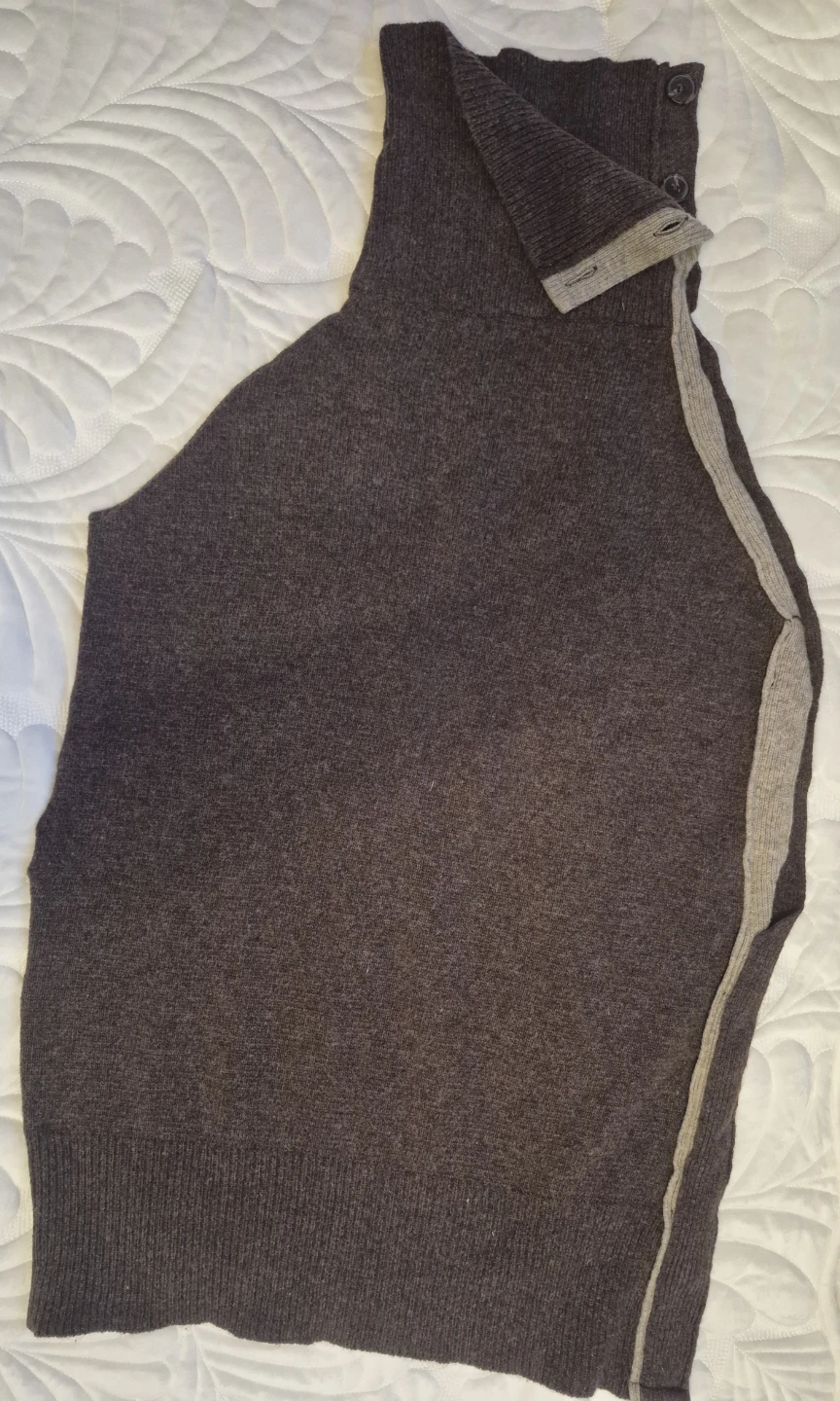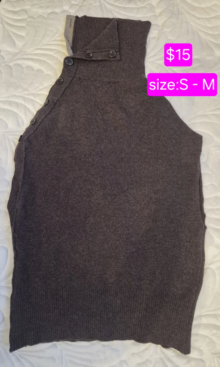 This dark brown sweater features a unique asymmetric button closure and a cozy sleeveless turtleneck design. It's crafted from a soft knit material, perfect for cooler weather. The size is S-M.