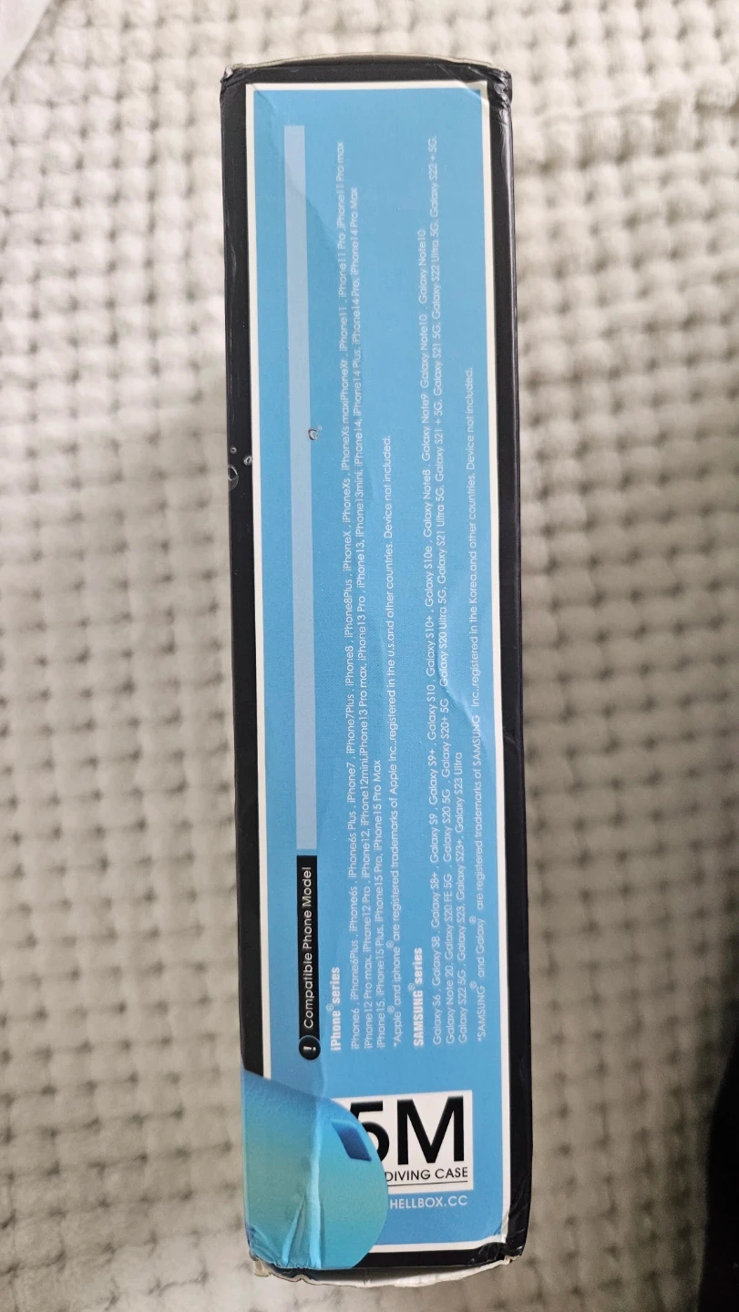 This is a blue SHELLBOX CASE waterproof diving case for phones. It's designed for protection during water activities. Includes a wrist strap.