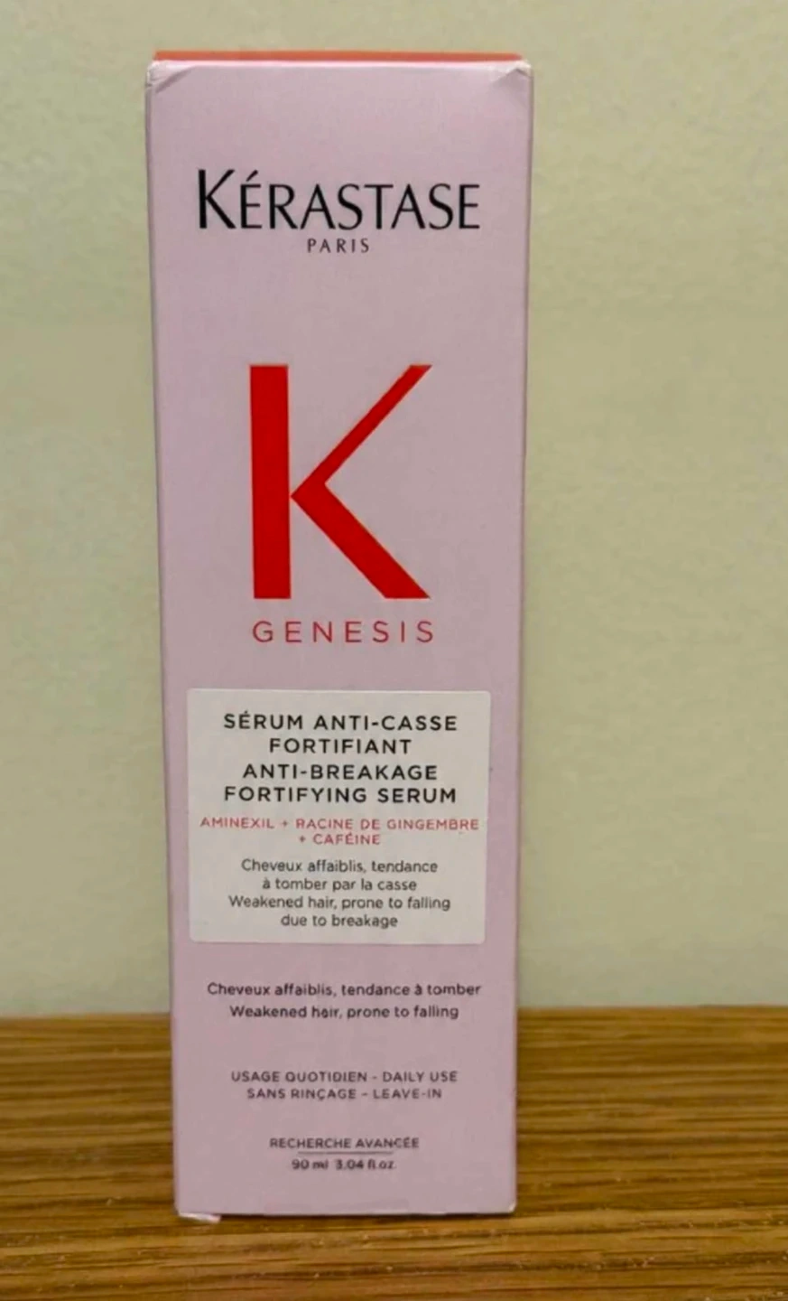 Selling a bottle of Kérastase Genesis Anti-Breakage Fortifying Serum. It's a serum designed to help with weakened hair that's prone to falling due to breakage. The bottle contains 90 ml / 3.04 fl oz and is suitable for daily use as a leave-in treatment