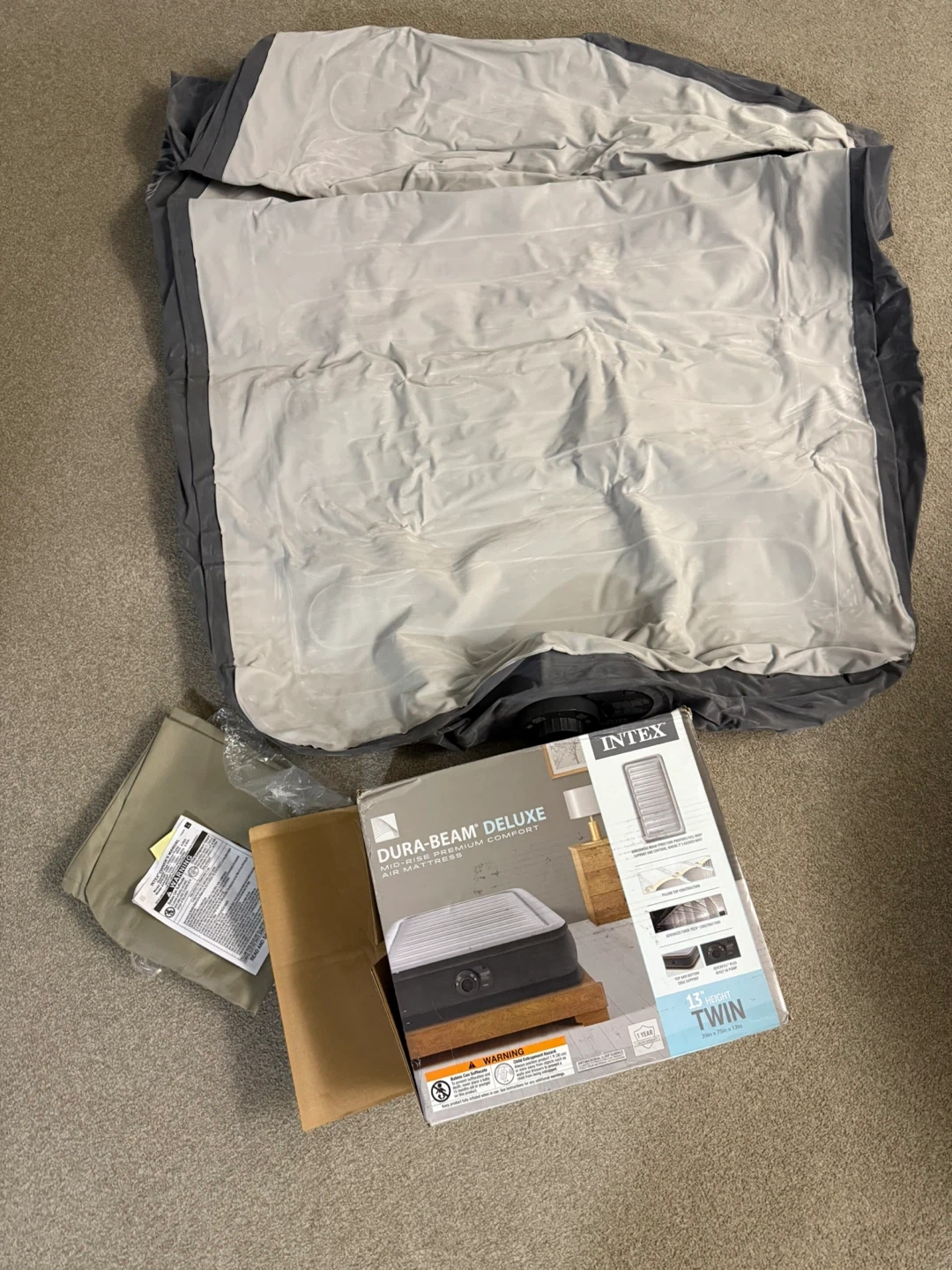 Description: Open Box, New Intex 64411ED Dura-Beam Deluxe Twin 13” Height Air Mattress.
