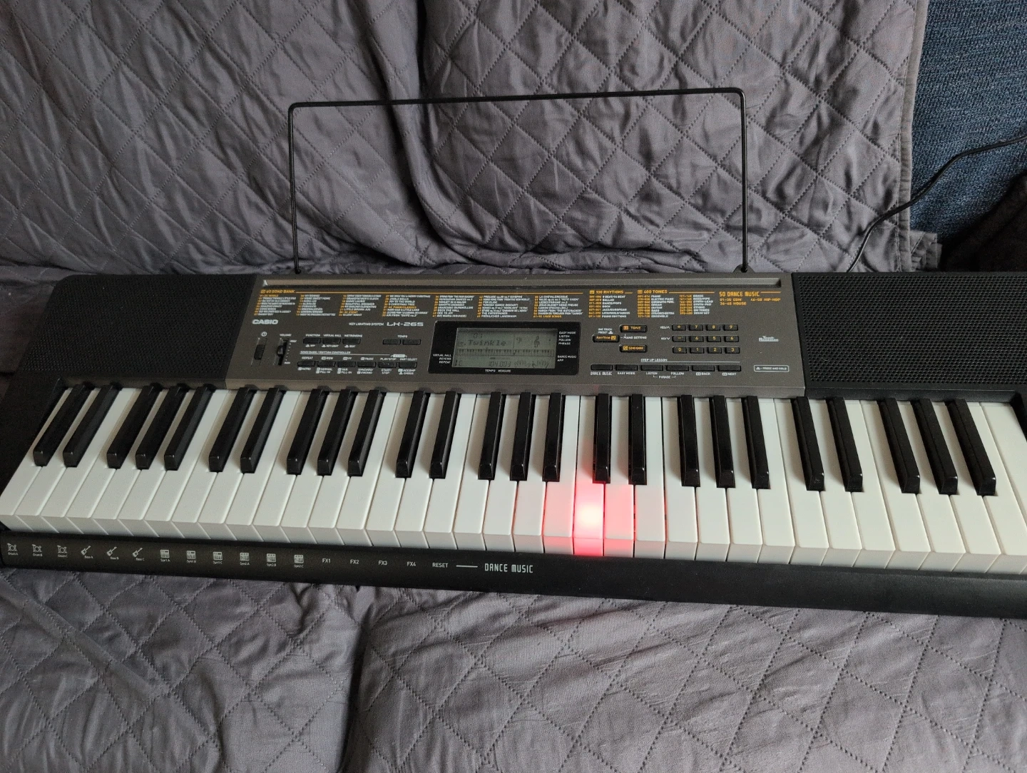 The Casio LK-265 is a 61-key portable keyboard designed specifically for beginners, using a visual lighting system to teach music. It serves as a transitional instrument that focuses on "instant gratification" to build confidence in new players. Comes with an adapter and it is minimally used.