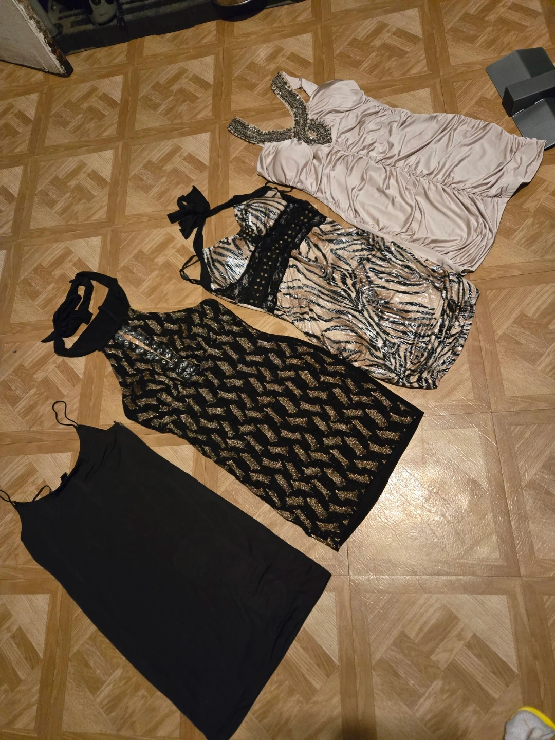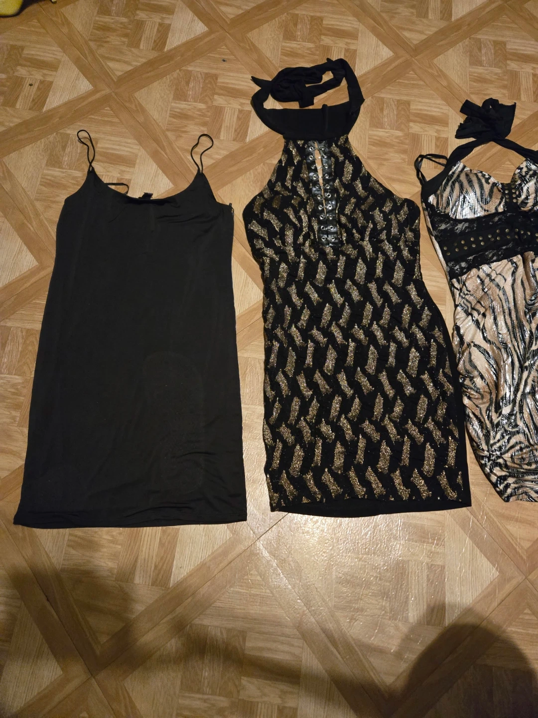 Selling a collection of women's dresses in various styles and colors. There's a black slip dress, a black and gold patterned halter dress, a tan and black animal print halter dress, and a beige dress with beaded neckline. Perfect for different occasions!