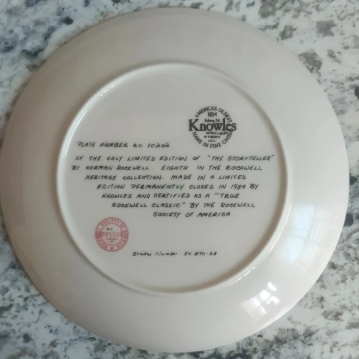 Collector plate titled "The Storyteller" by Norman Rockwell. Eighth in the Rockwell Heritage Collection. Made in a limited edition in 1984. Certified as a "True Rockwell Classic" by The Rockwell Society of America.