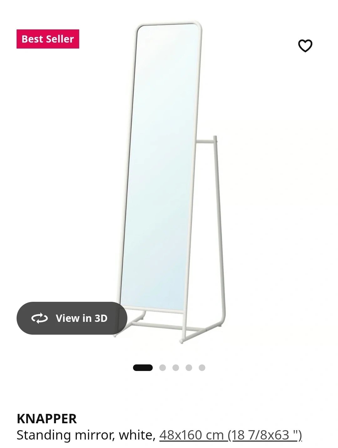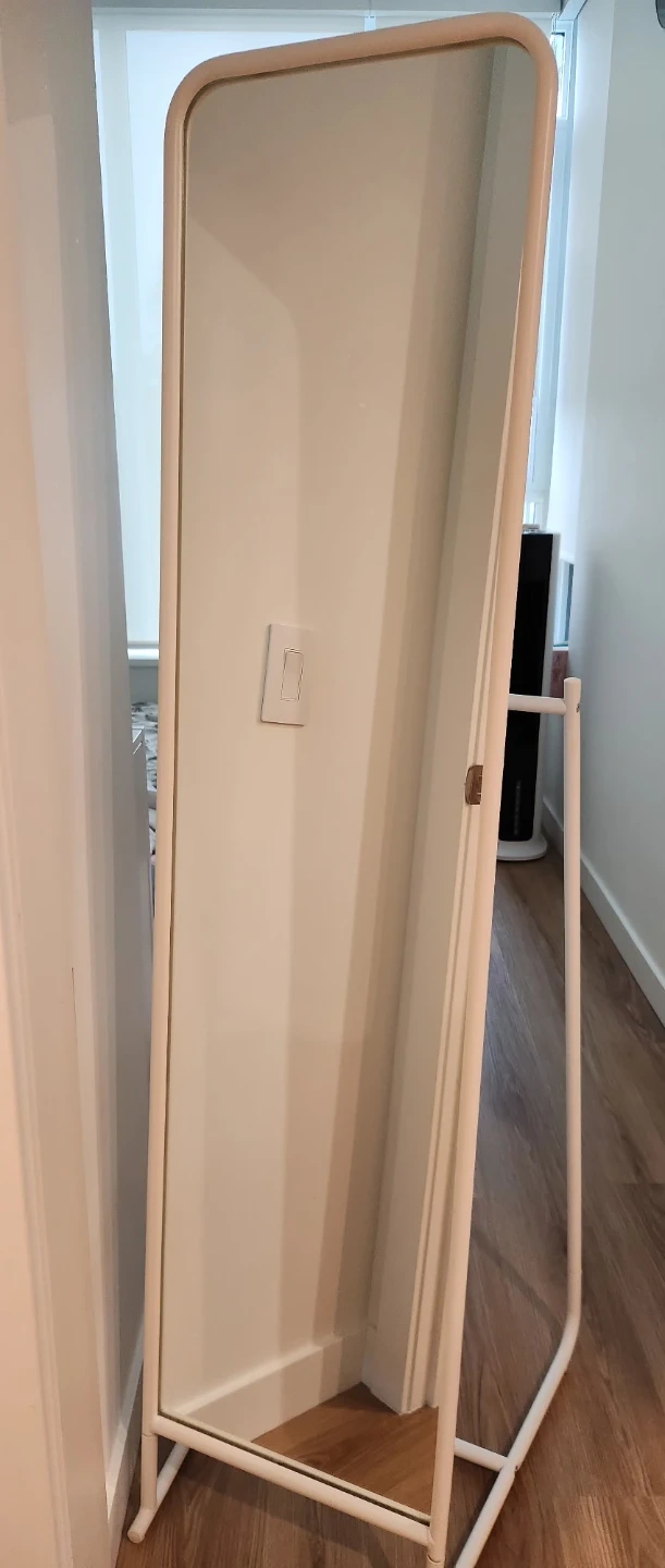 IKEA KNAPPER standing mirror in white. It's 48x160 cm, great for checking your outfit. The back has hooks for hanging items.